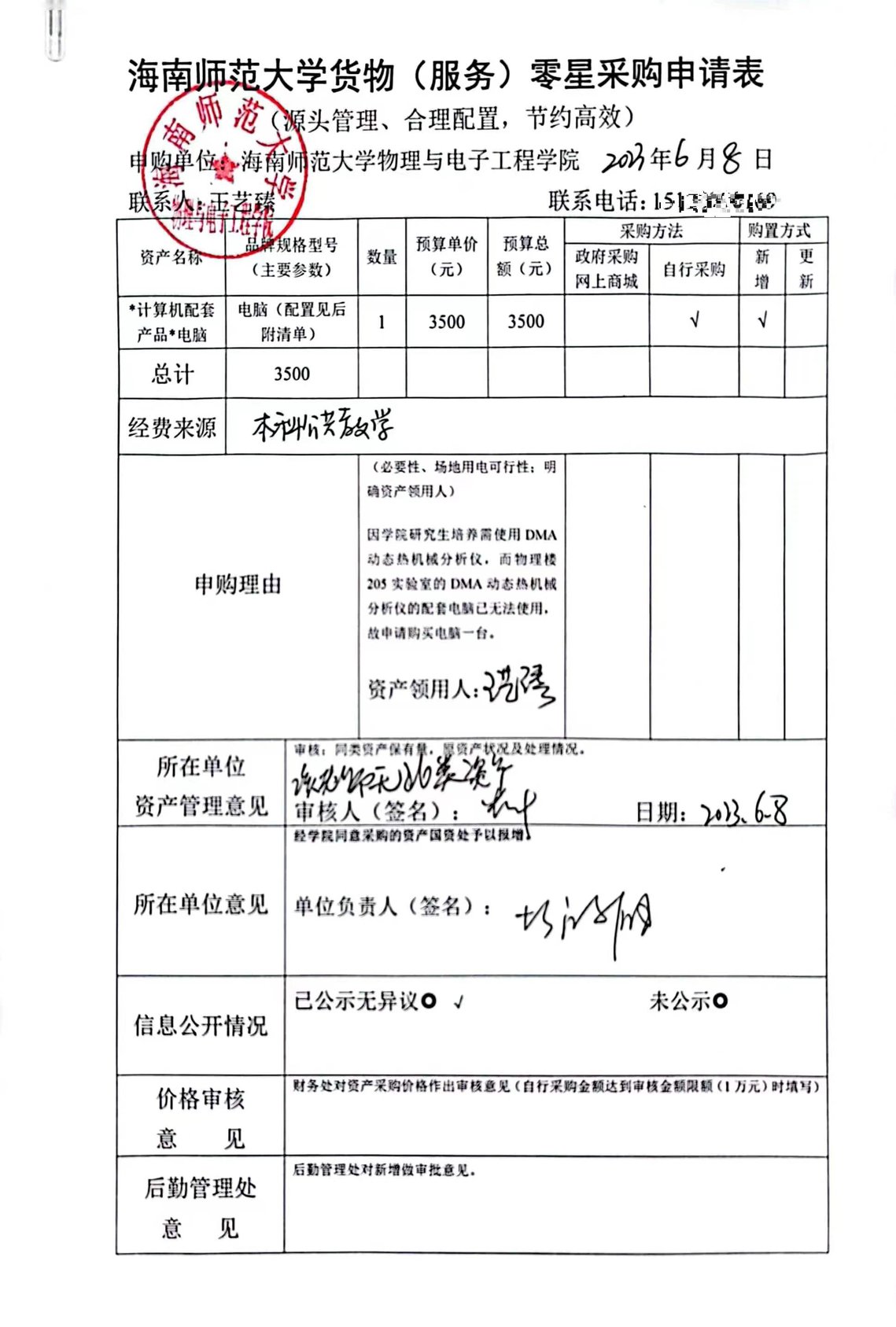 物理与电子工程学院王艺臻采购实验电脑设备一台,公示如下,公示时间:2023年6月8日-6月12日。