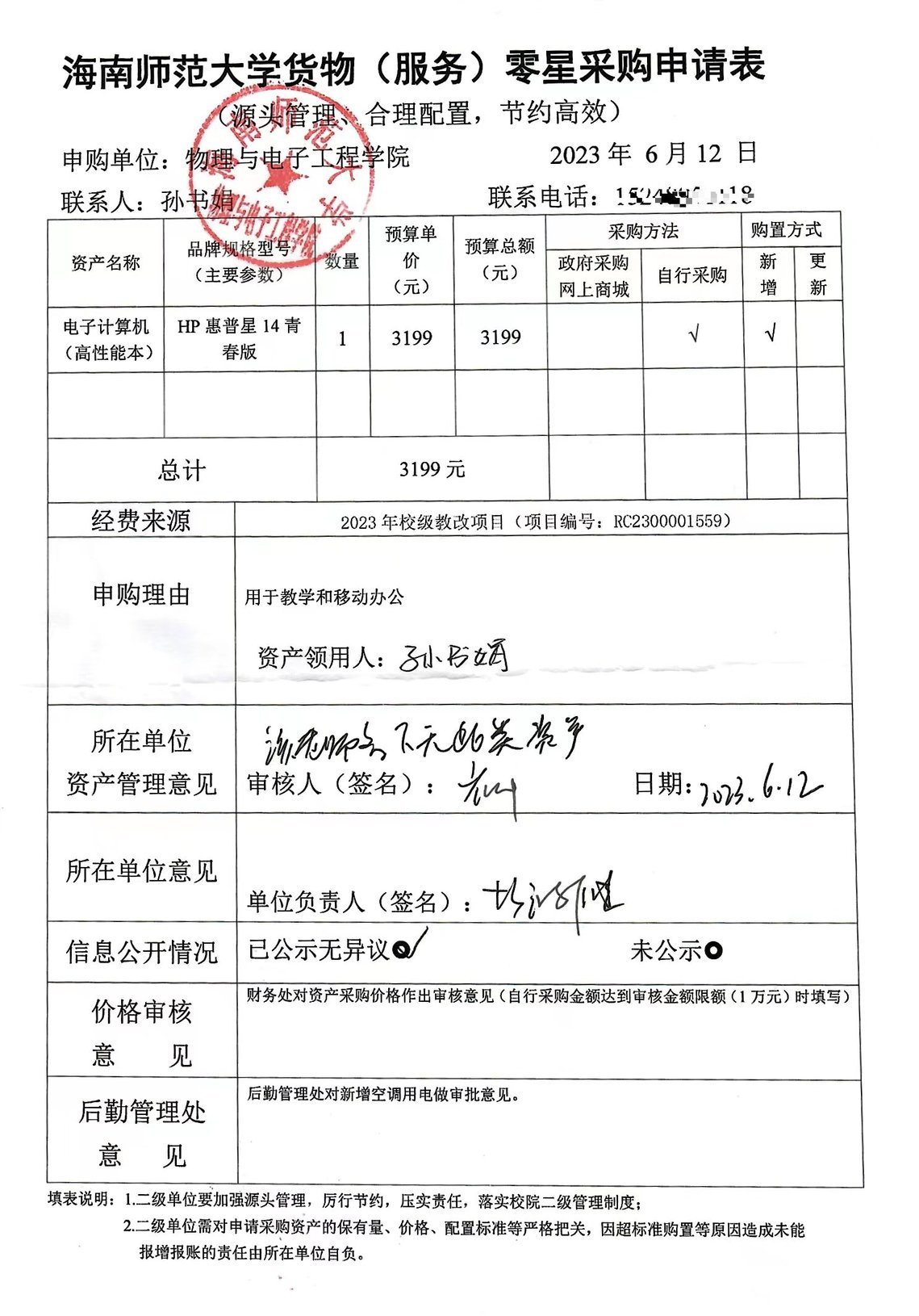 物理与电子工程学院孙书娟老师购买教学、办公电脑一台,公示时间2023年6月12-6月15日。