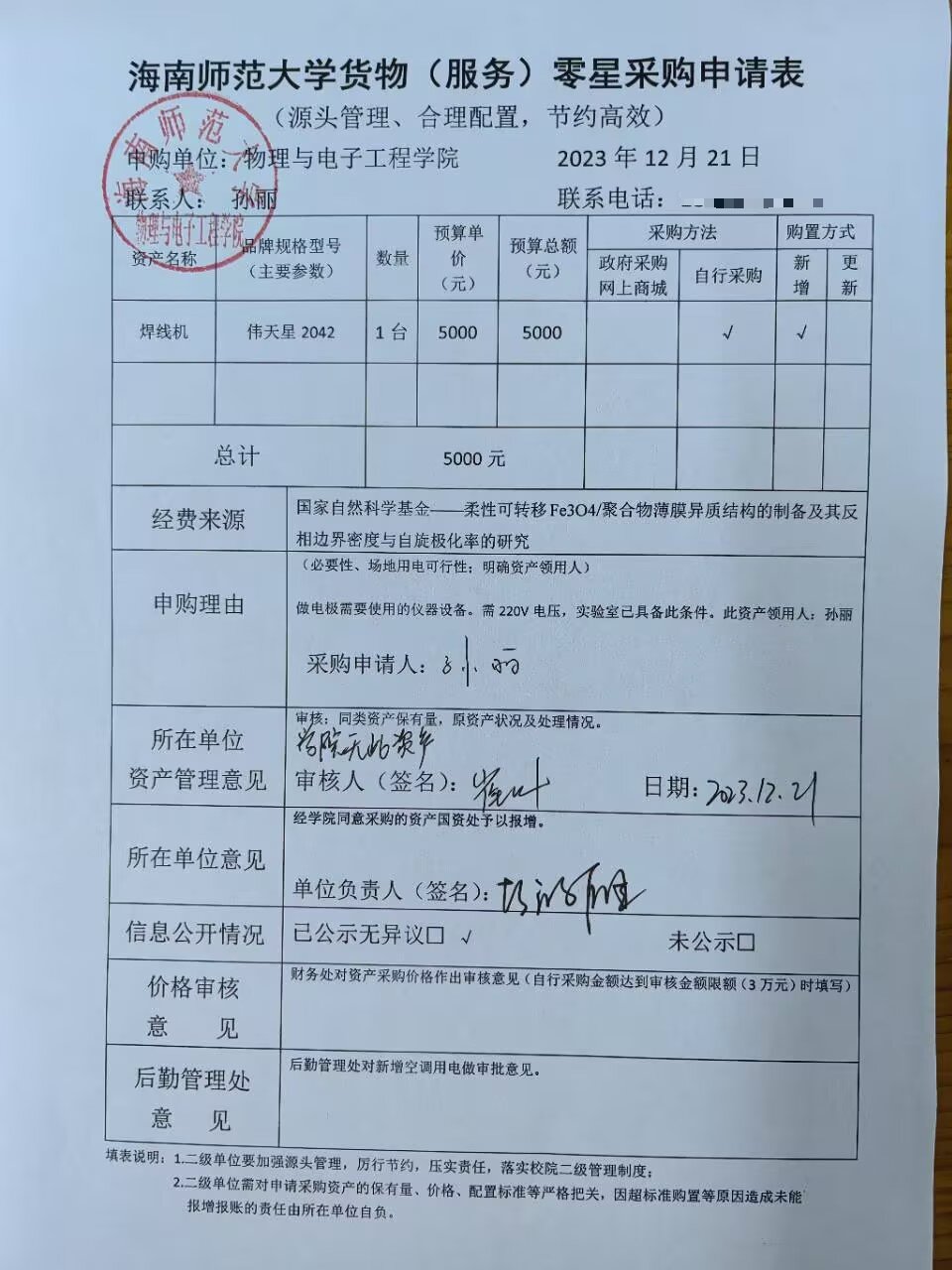 物理与电子工程学院孙丽购买实验设备,公示如下,公示时间:2023年12月21-12月26日。