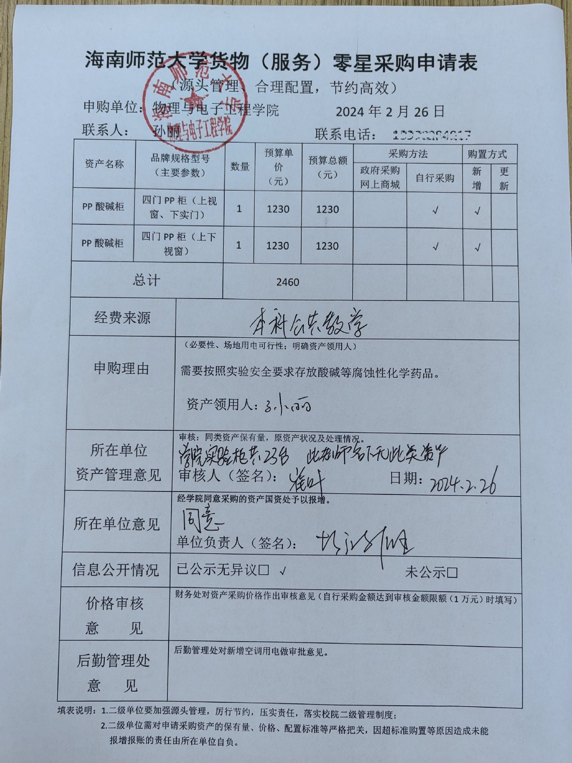 物理与电子工程学院孙丽购买实验设备,公示如下,公示时间:2024年2月26-2月29日。