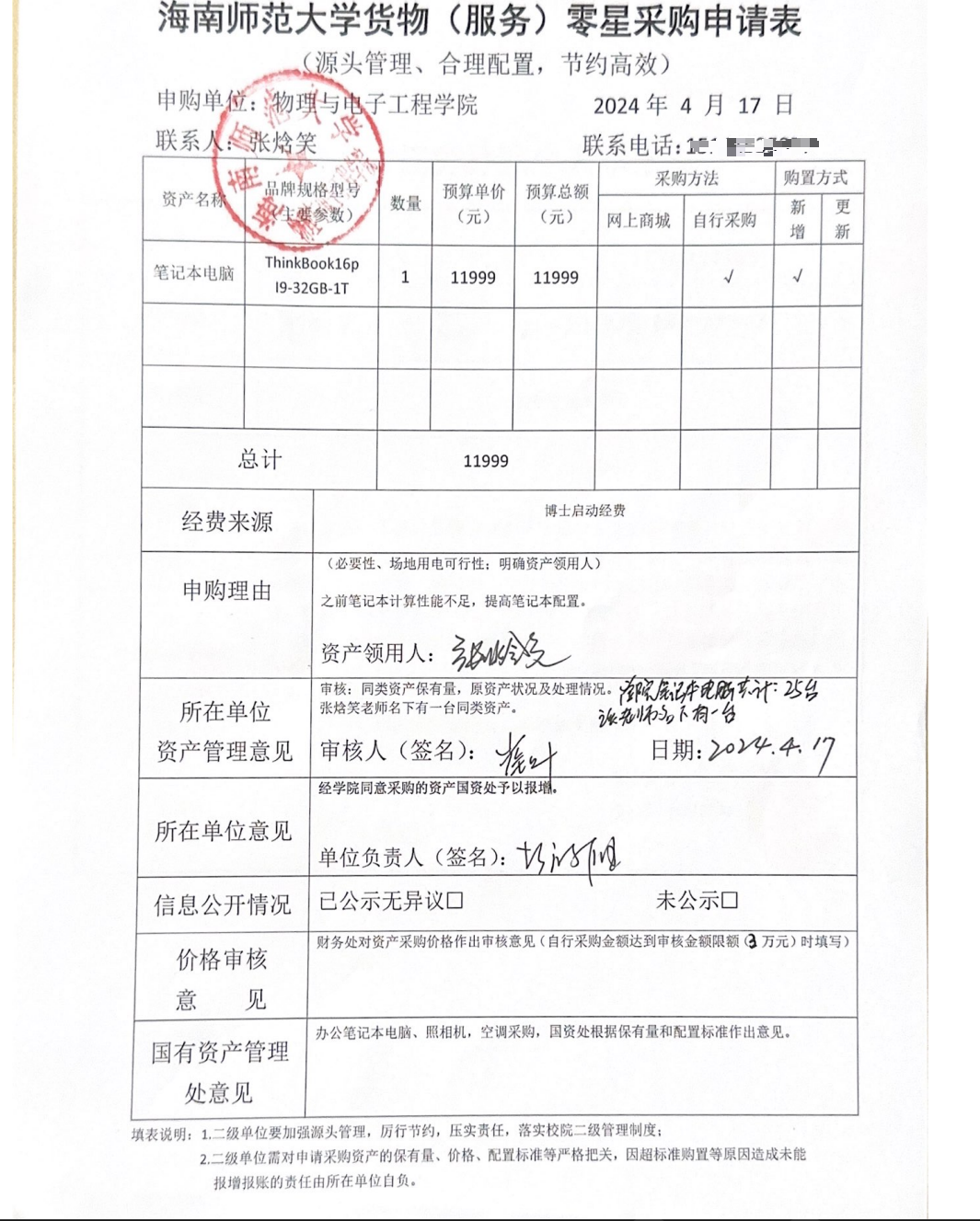 物理与电子工程学院张焓笑购买实验设备,公示如下,公示时间:2024年4月17日-4月22日。