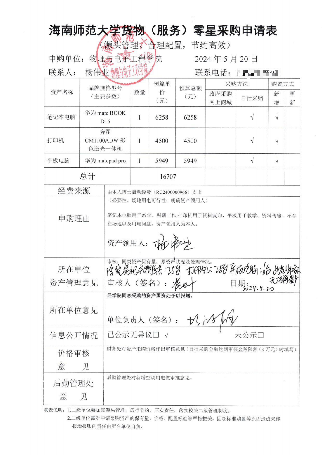 物理与电子工程学院杨伟业购买实验设备,公示如下,公示时间:2024年5月22日-5月27日。
