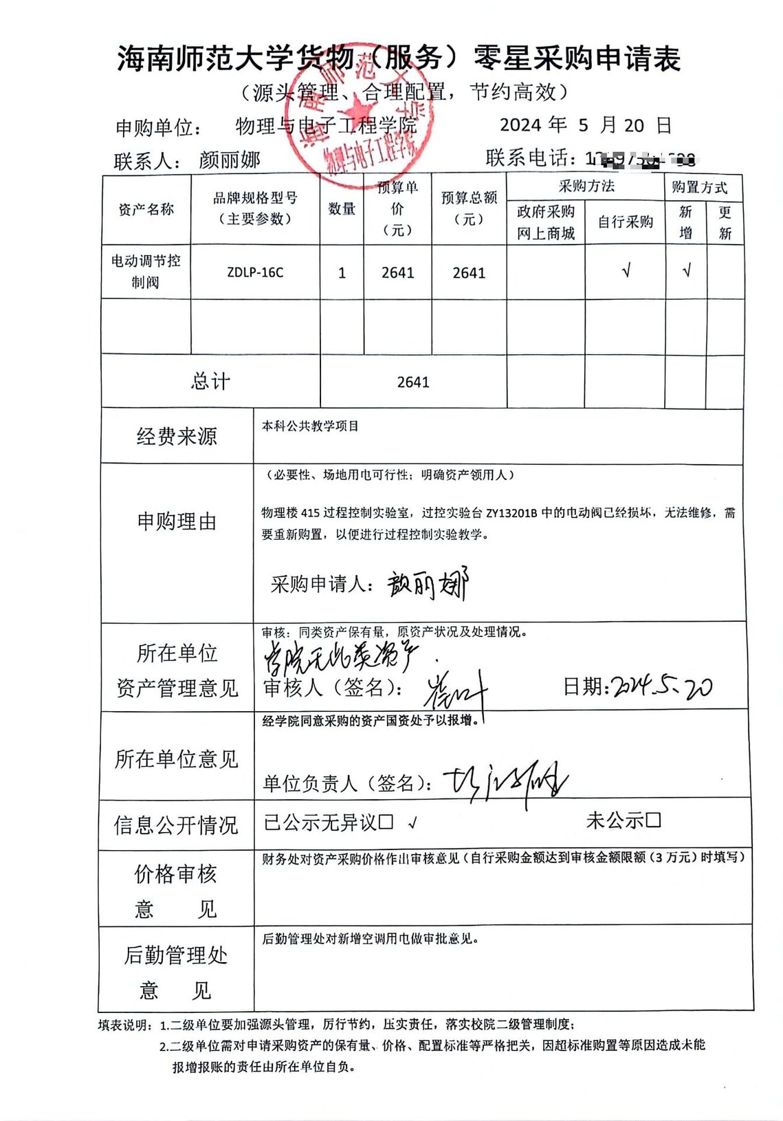 物理与电子工程学院颜丽娜购买实验设备,公示如下,公示时间:2024年5月23日-5月28日。