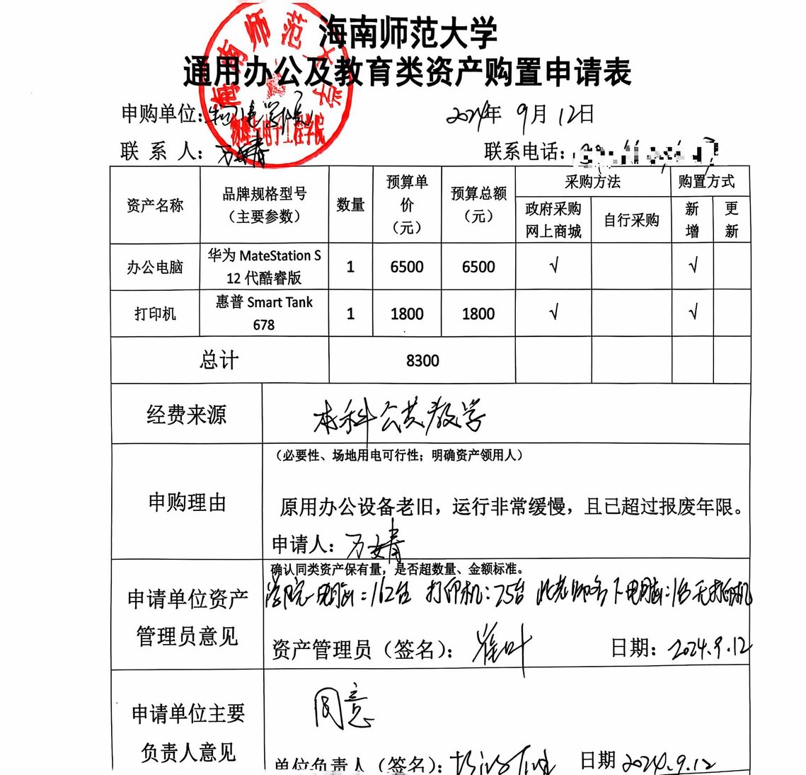 物理与电子工程学院万婧购买办公设备,公示如下,公示时间:2024年9月12日-9月18日。