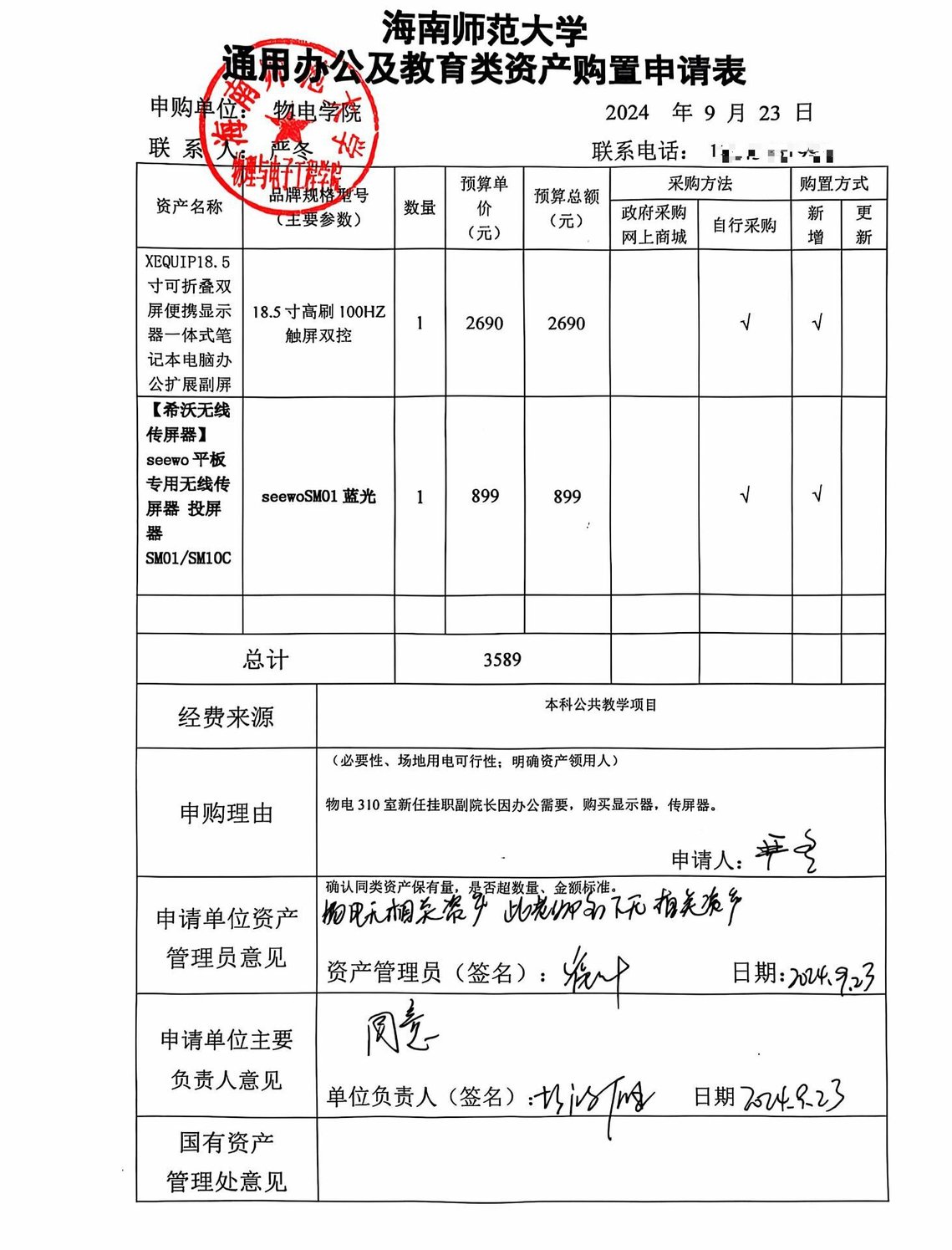 物理与电子工程学院严冬购买办公设备,公示如下,公示时间:2024年9月23日-9月26日。