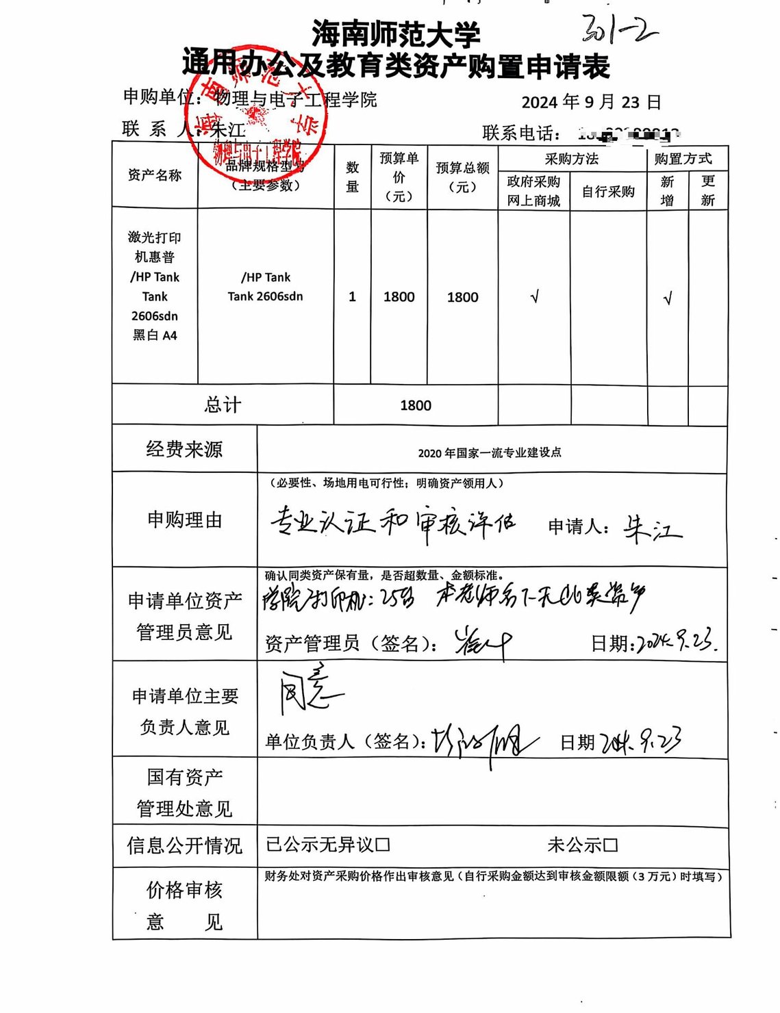 物理与电子工程学院朱江购买办公设备,公示如下,公示时间:2024年9月23日-9月26日。
