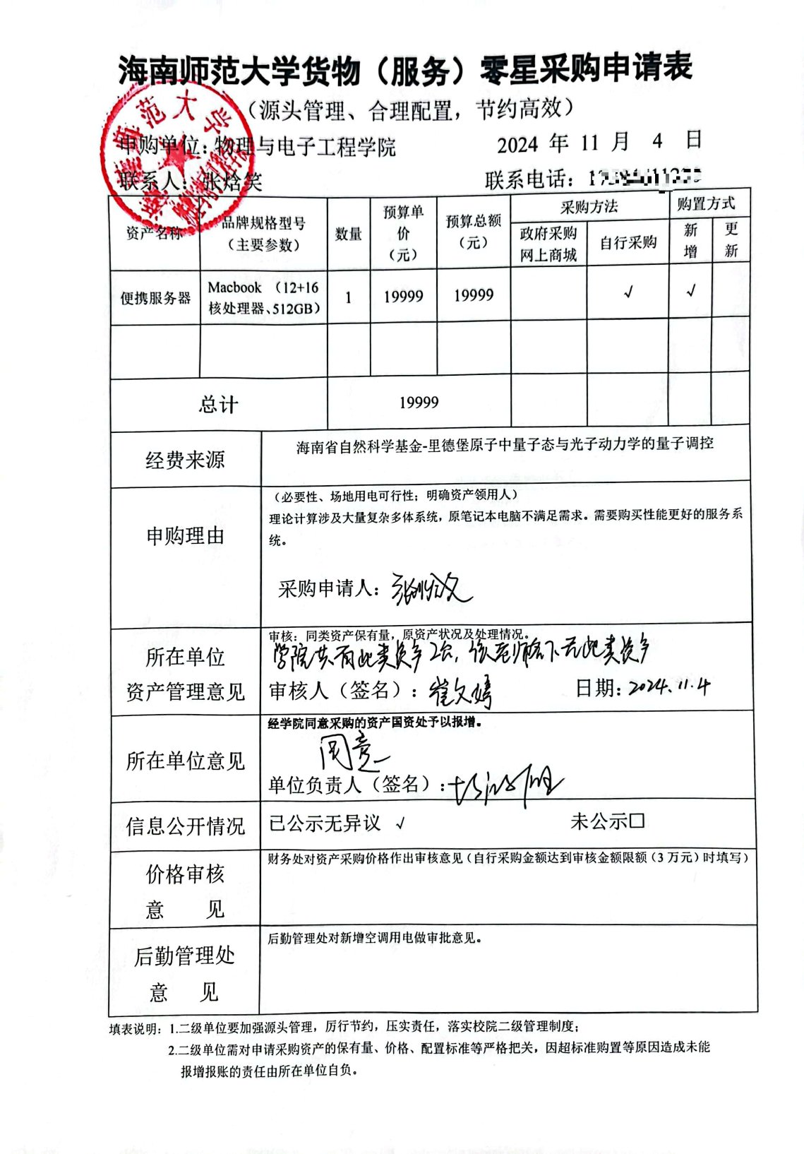 物理与电子工程学院张焓笑购买办公设备,公示如下,公示时间:2024年11月5日-11月8日。