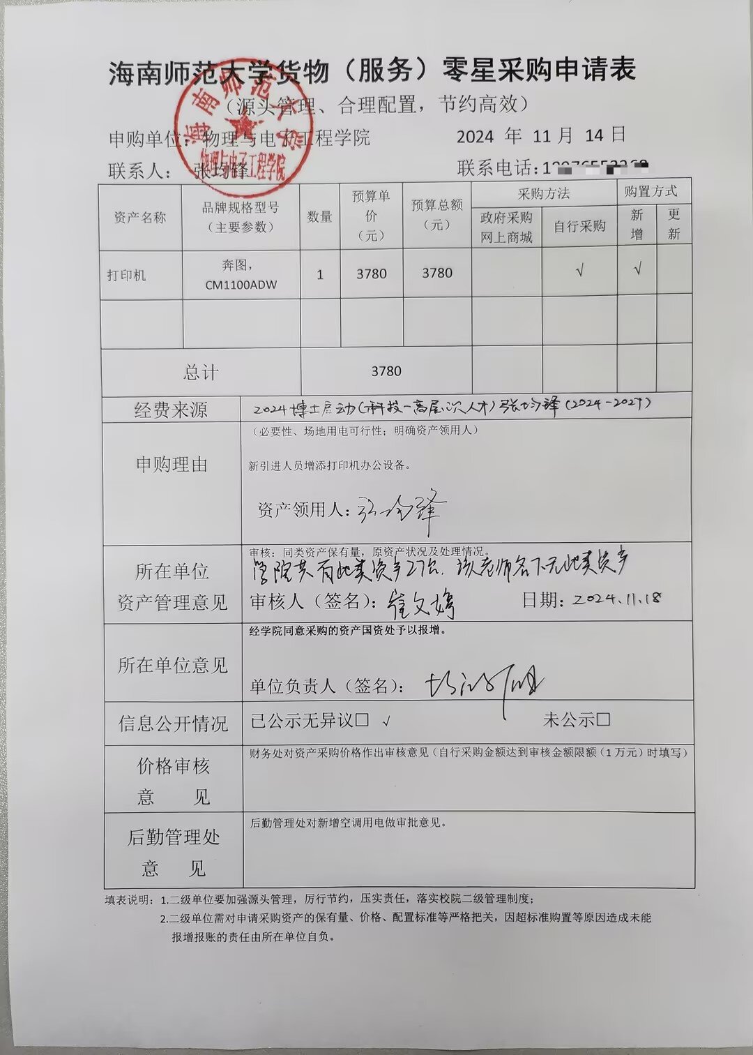 物理与电子工程学院张均锋购买办公设备,公示如下,公示时间:2024年11月18日-11月21日。