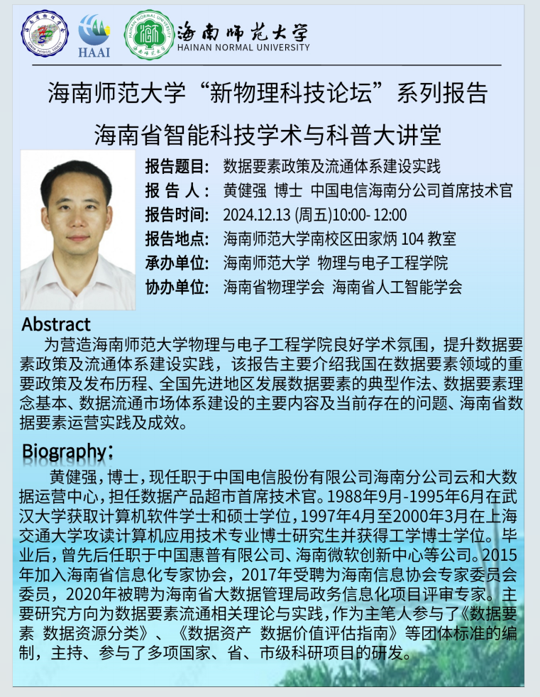 海南师范大学“新物理科技论坛” 系列报告 海南省智能科技学术与科普大讲堂