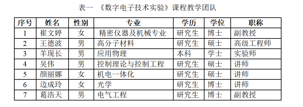 实验室承担学院电子信息科学与技术、光电信息科学与工程和自动化等三个本科专业的《数字电子技术实验》课程。开设的实验项目有:TTL、CMOS集成逻辑门的逻辑功能与参数测试、组合逻辑电路的设计与测试、译码器及其应用、数据选择器及其应用、触发器及其应用、计数器及其应用、移位寄存器及其应用、555时基电路及其应用、智力竞赛抢答装置等。