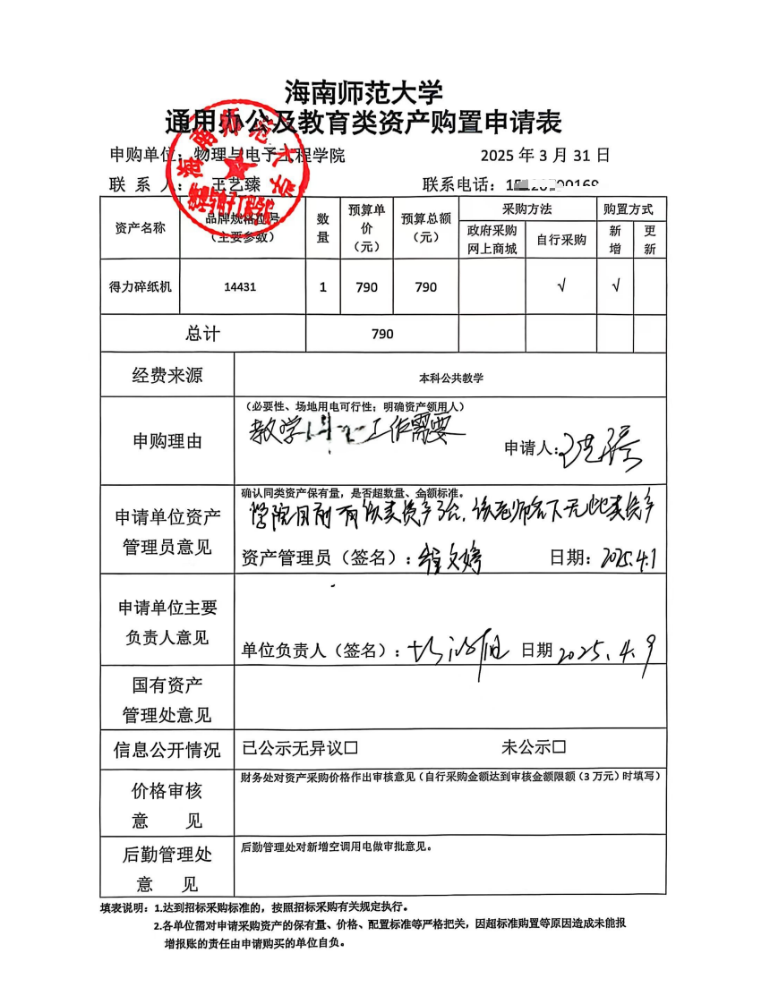 物理与电子工程学院王艺臻购买办公设备,公示如下,公示时间:2025年4月9日-4月14日。