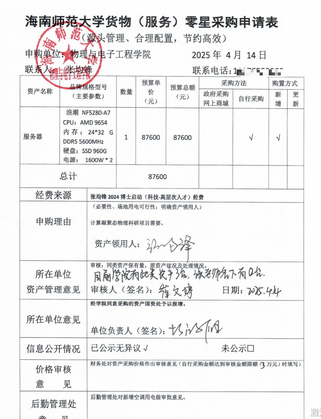物理与电子工程学院张均锋购买实验设备,公示如下,公示时间:2025年4月14日-4月17日。