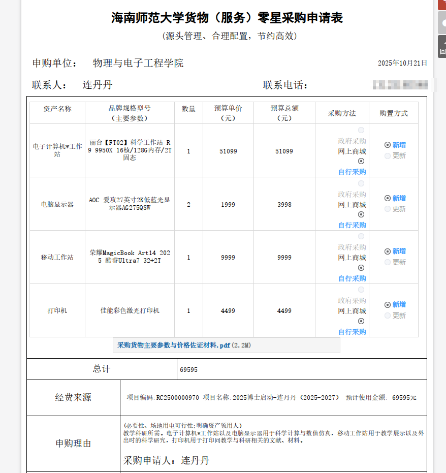 物理与电子工程学院连丹丹购买办公设备,公示如下,公示时间:2025年10月23日-10月28日。