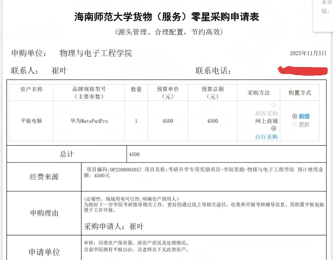物理与电子工程学院崔叶购买办公设备,公示如下,公示时间:2025年11月5日-11月9日。