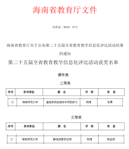 8月3日,从海南省教育厅关于公布第二十五届全省教育教学信息化评比活动结果的通知中获悉,我校物理与电子工程学院学子张勇制作的多媒体课件:“通电导线在磁场中受到的力”获得二等奖,陈益娇制作的多媒体课件“静电...