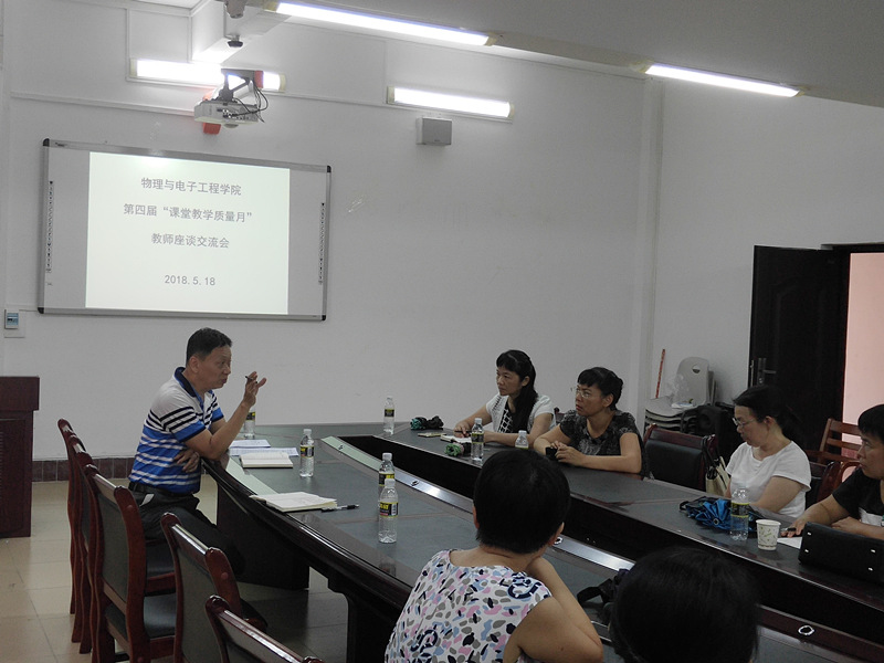 根据学校第四届“课堂教学质量月”活动安排,5月18日下午,我院在物理楼201会议室分别组织召开教师、学生代表座谈会,广泛征求师生们的意见。学院院长彭鸿雁、副院长谢琼涛、物理系系主任姚仲瑜、教研室主任潘孟美和...