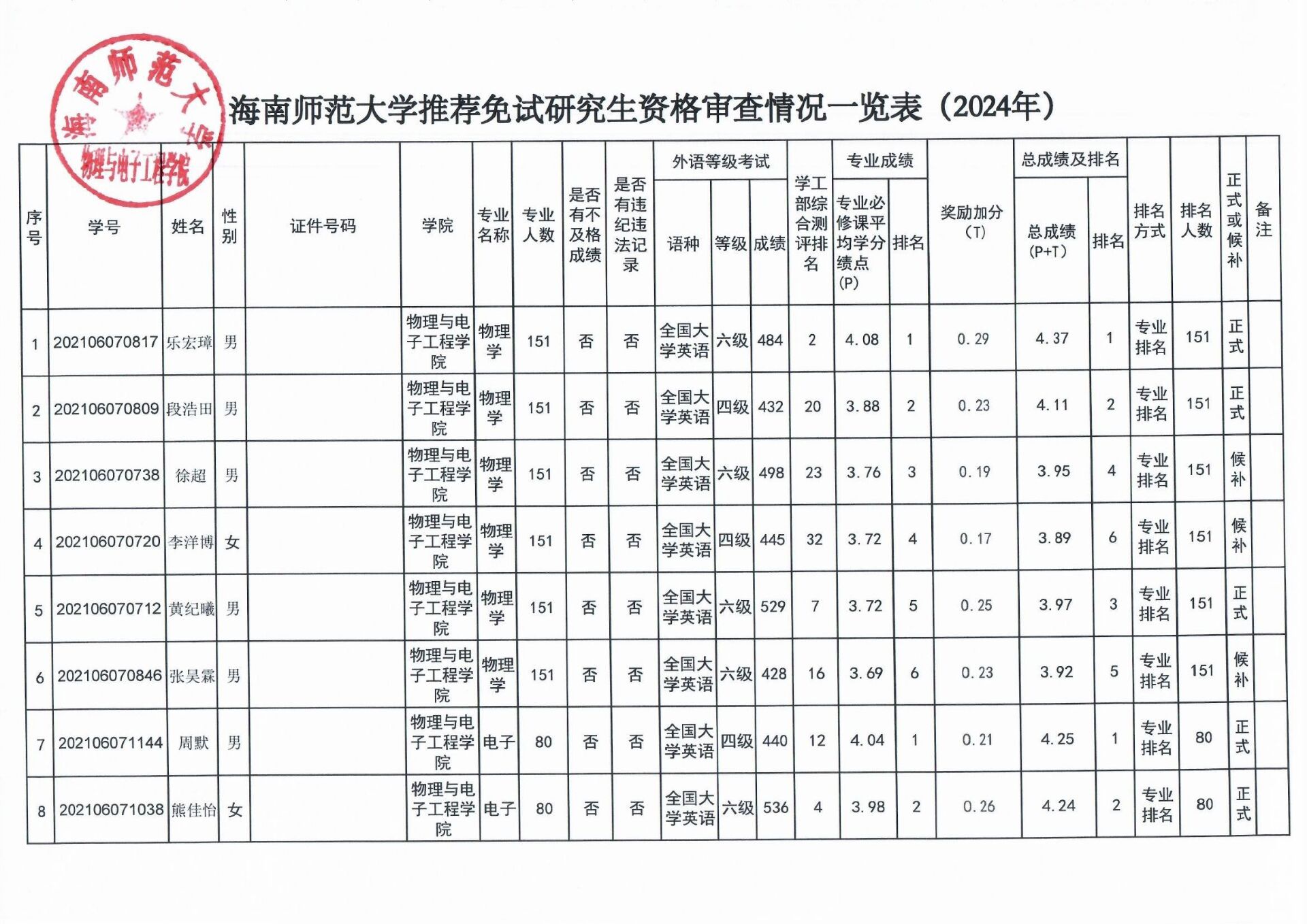 根据教育部与教育厅有关文件精神及《海南师范大学推荐优秀应届本科毕业生免试攻读硕士研究生工作实施办法》、《物理与电子工程学院推荐优秀2025届本科毕业生免试攻读硕士学位研究生推荐考核实施办法》,经资格审查、...