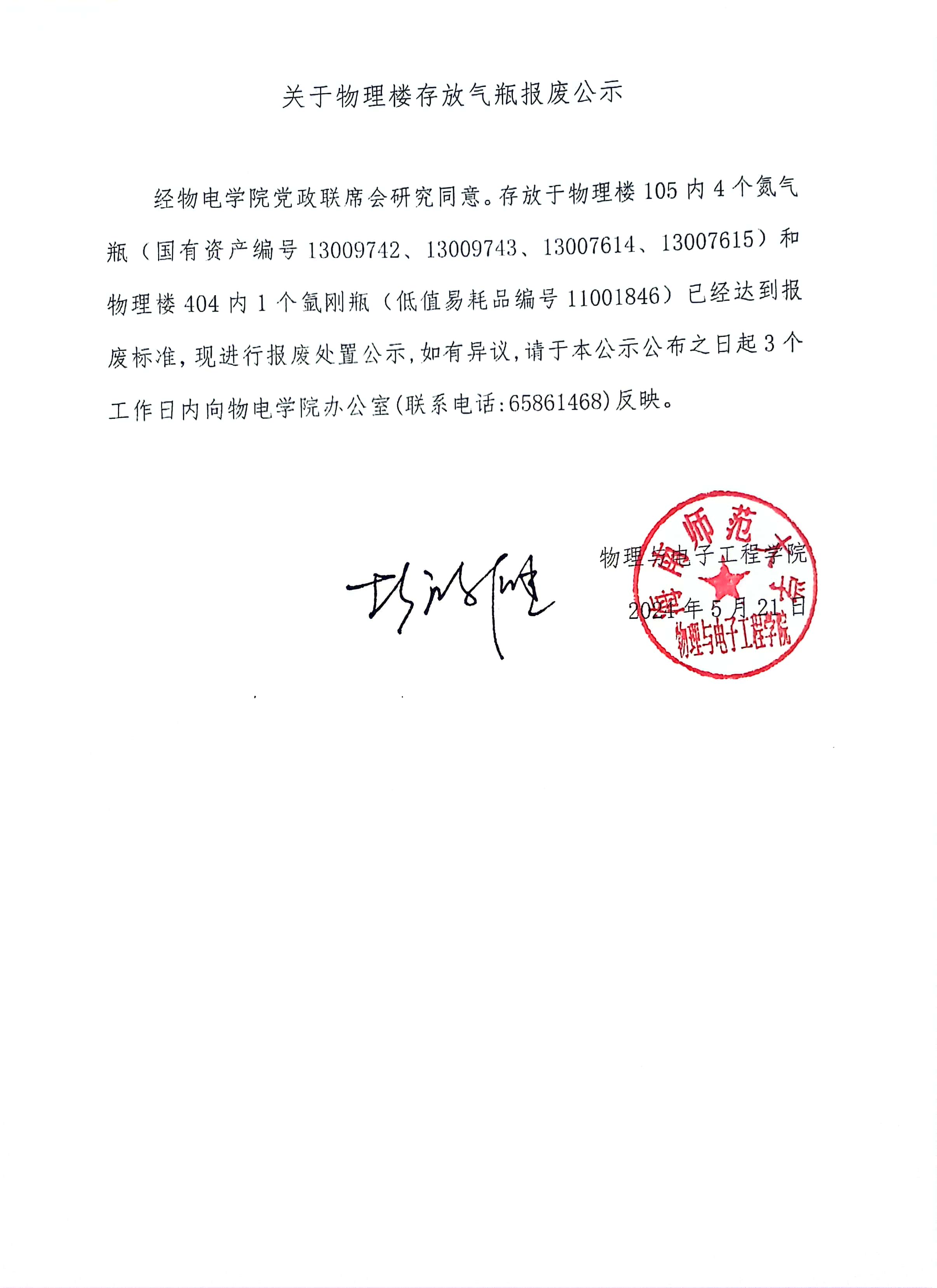 物理与电子工程学院国有资产报废,公示如下,公示时间:2024年5月21日-5月24日。