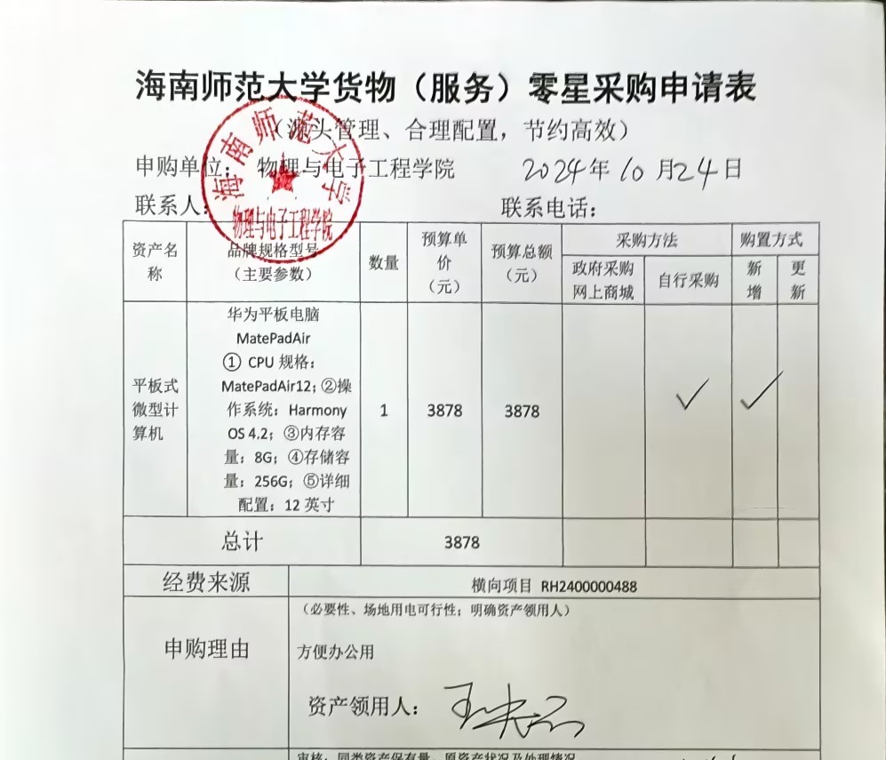 物理与电子工程学院王德波购买办公设备,公示如下,公示时间:2024年11月11日-11月14日。
