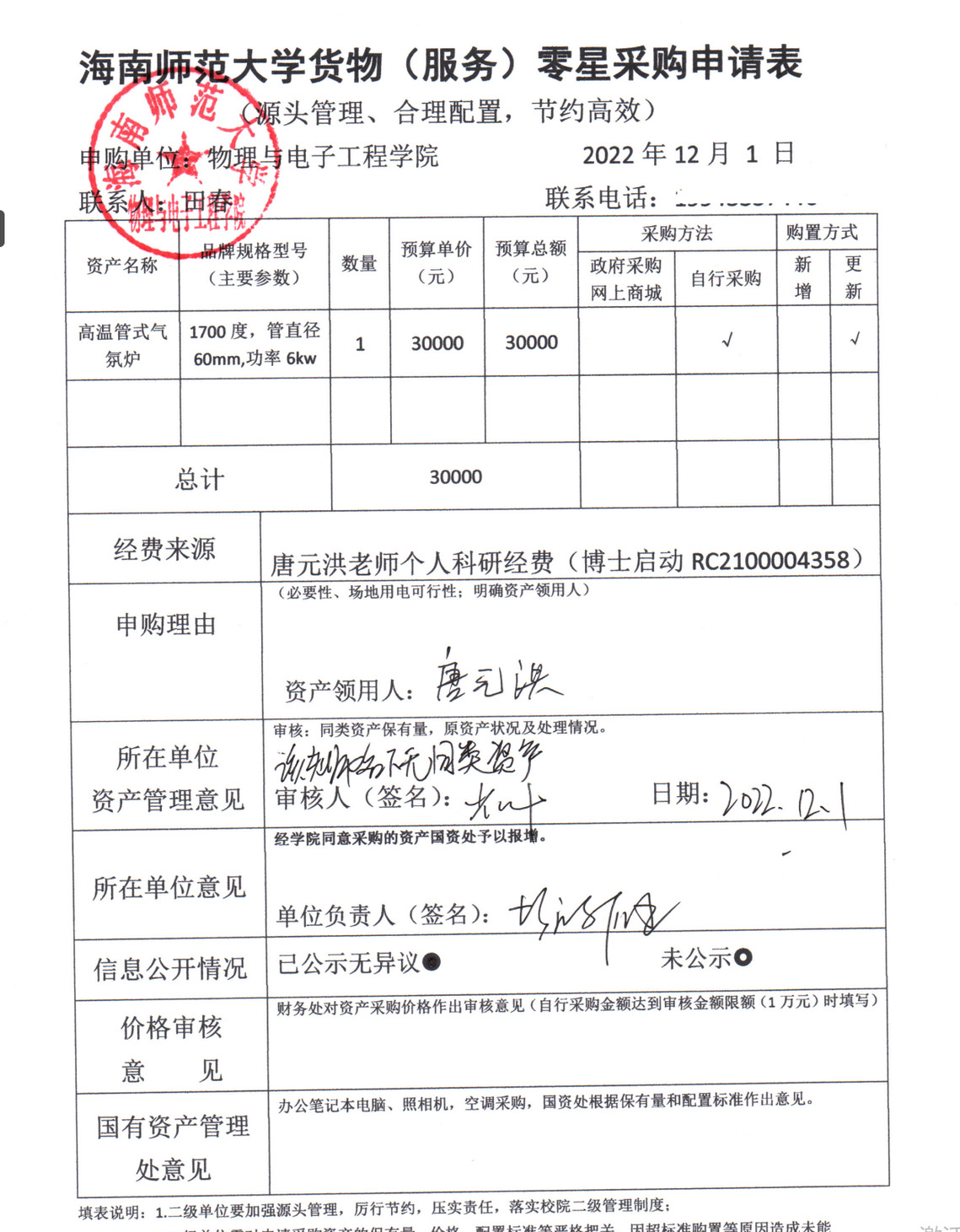 物理与电子工程学院唐元洪老师需要采购实验室设备,公示如下,公示时间:2022年12月1日-12月5日。