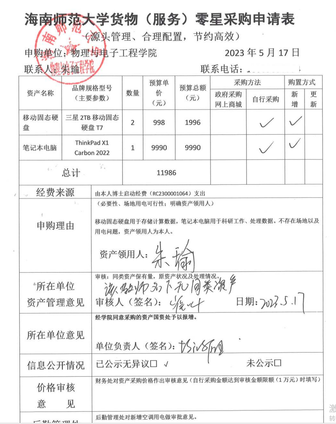 物理与电子工程学院王艺臻采购实验电脑设备一台,公示如下,公示时间:2023年6月8日-6月12日。
