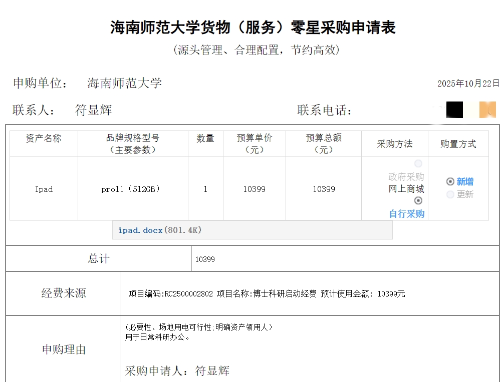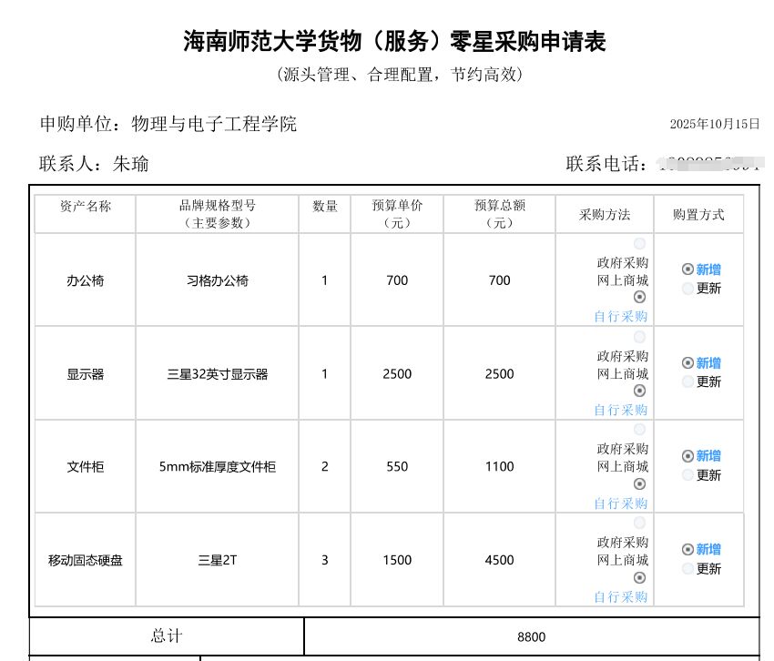 物理与电子工程学院符显辉购买办公设备,公示如下,公示时间:2025年10月24日-10月29日。