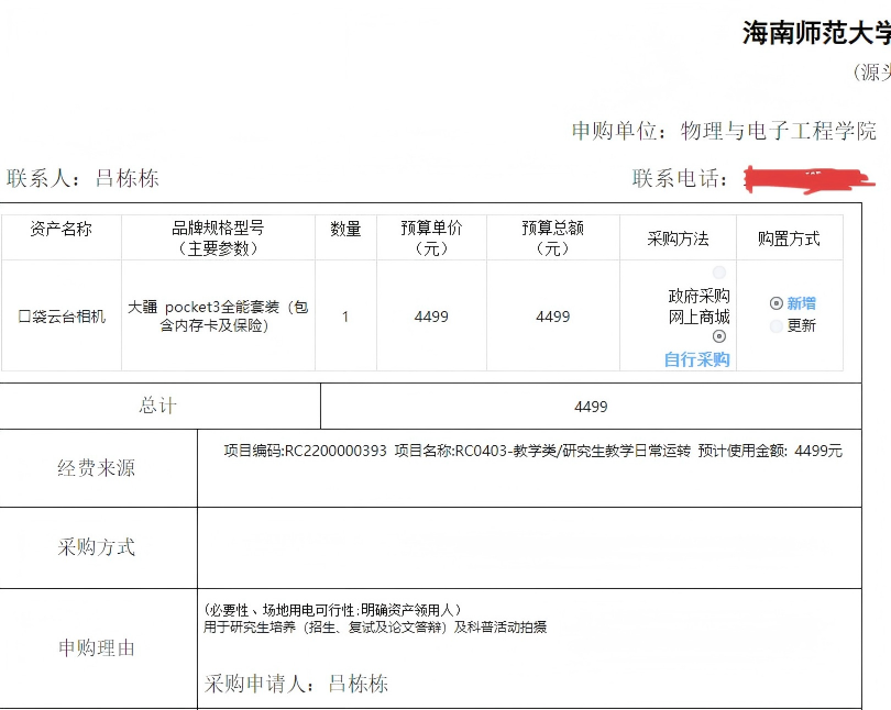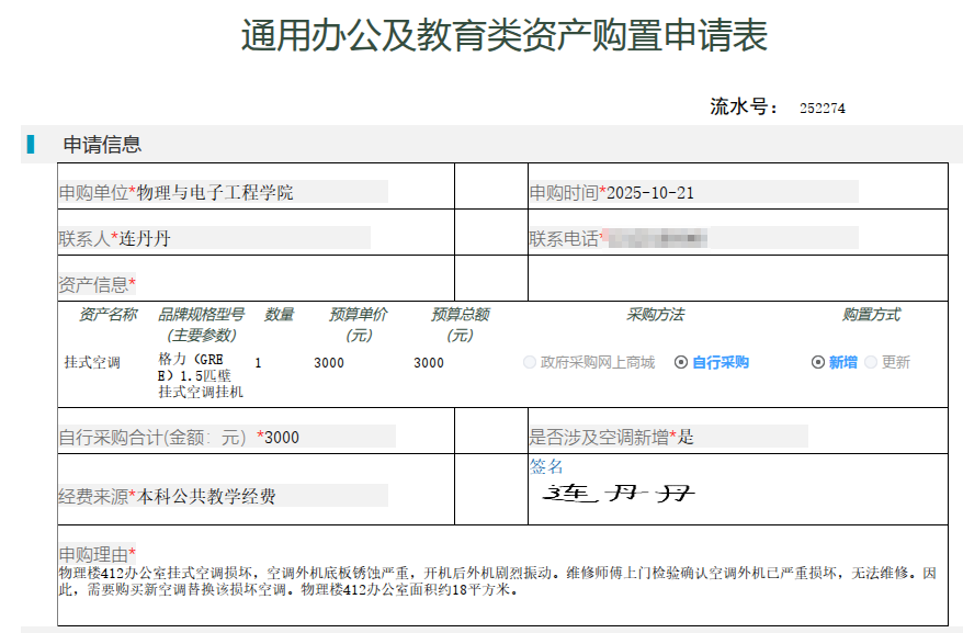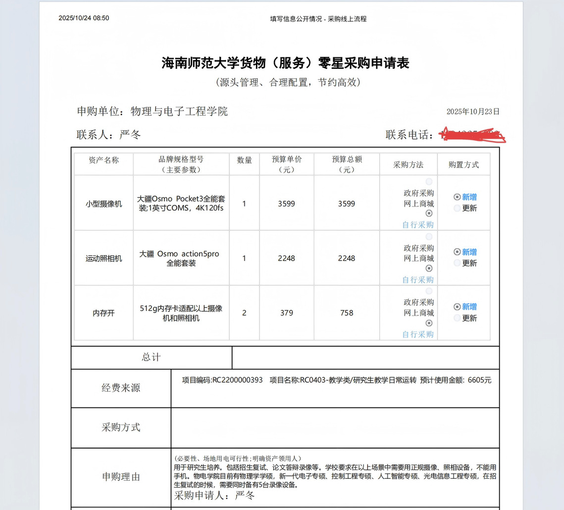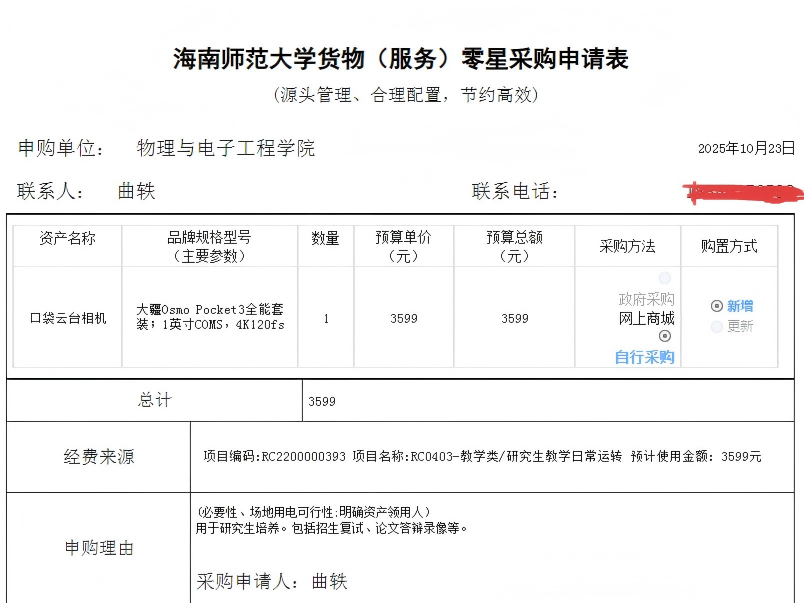 物理与电子工程学院吕栋栋购买办公设备,公示如下,公示时间:2025年10月27日-10月30日。