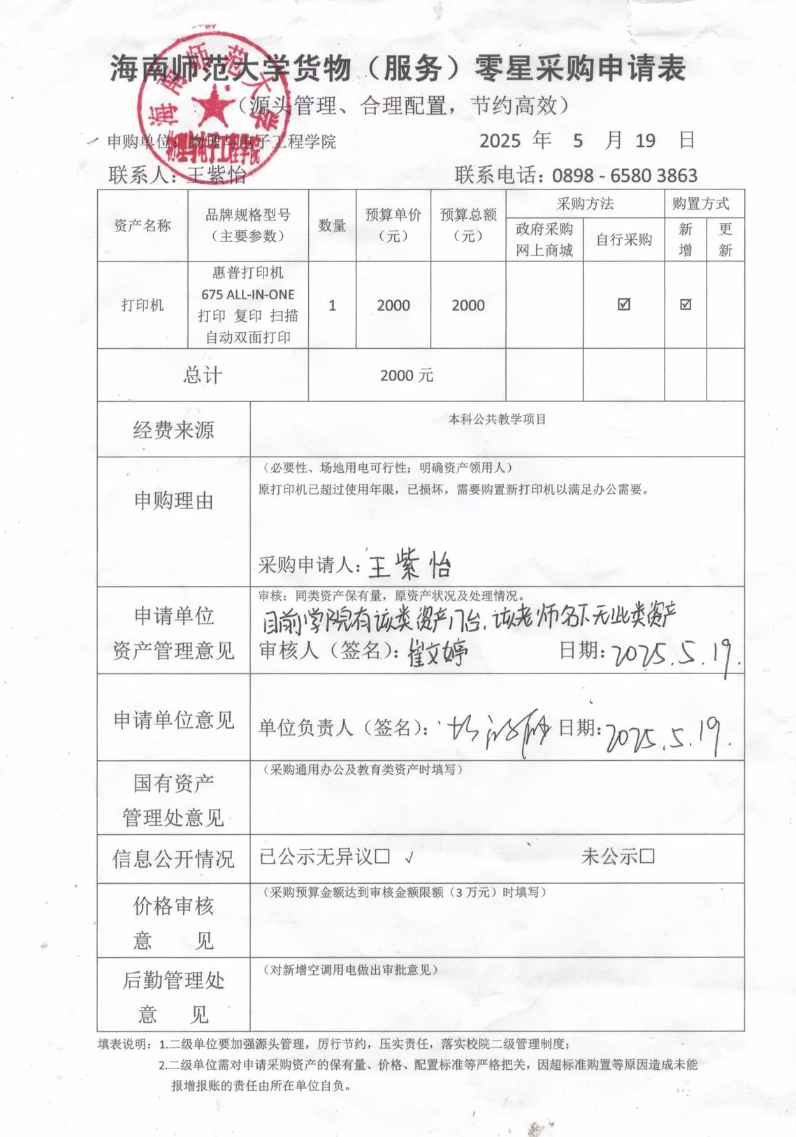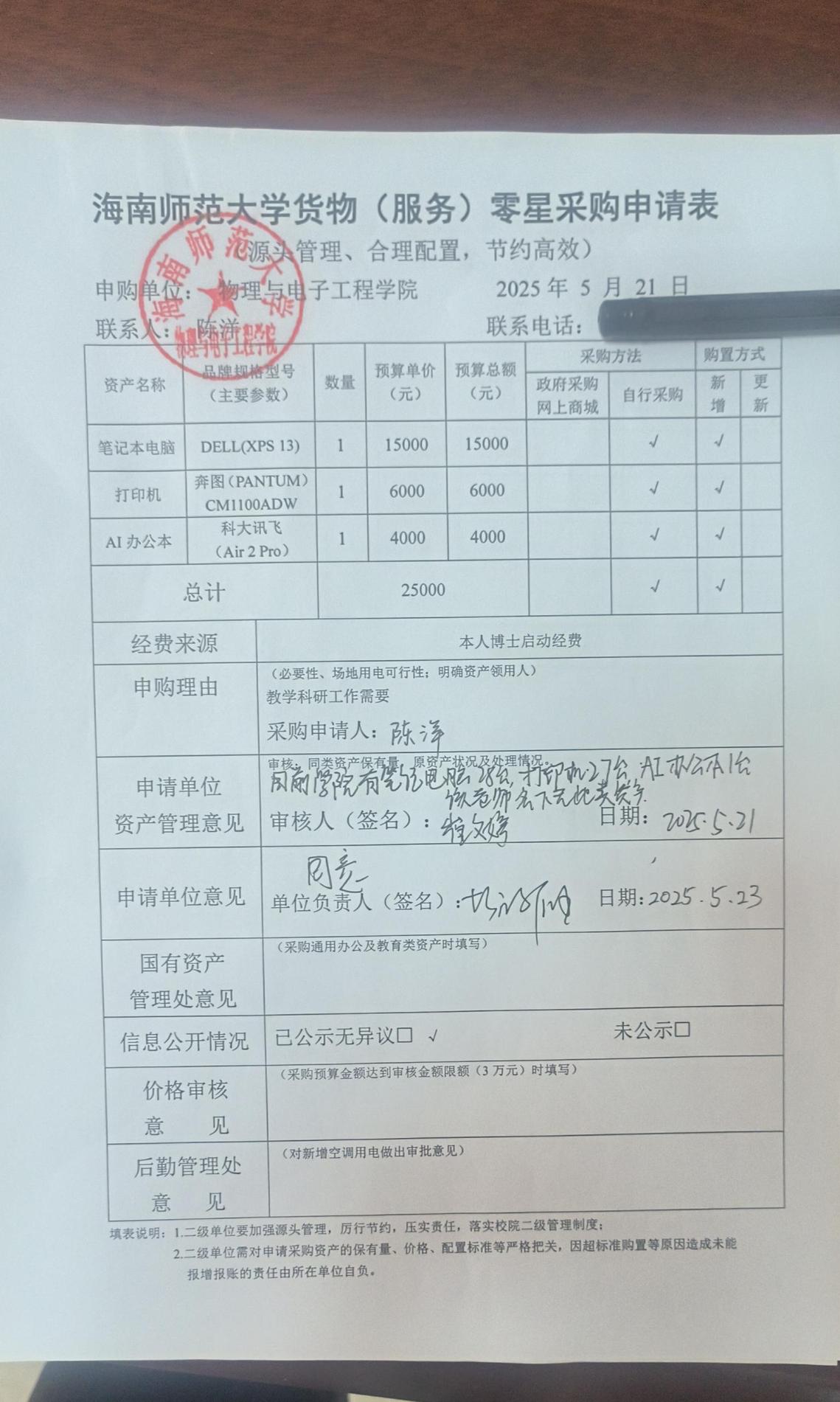 物理与电子工程学院王紫怡购买办公设备,公示如下,公示时间:2025年5月19日-5月22日。