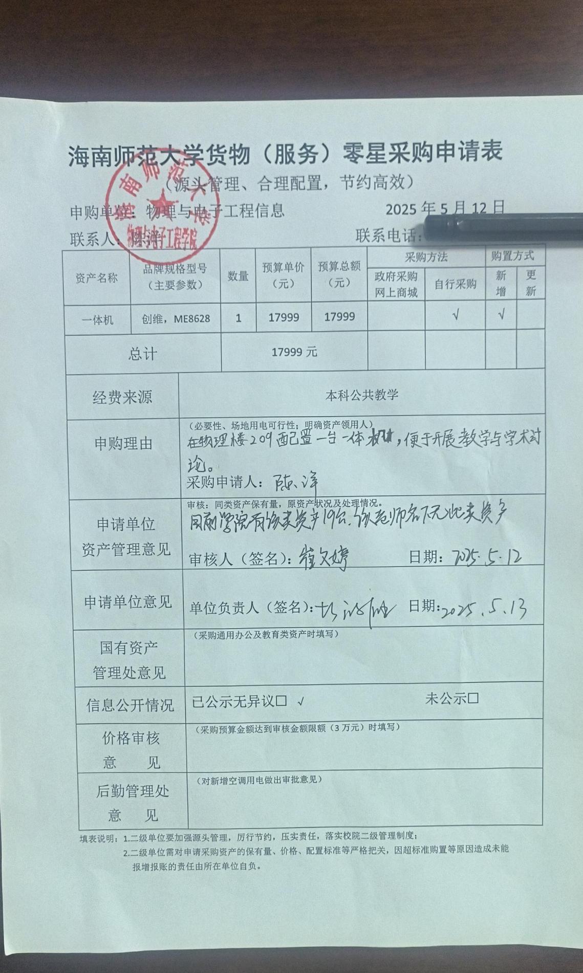 物理与电子工程学院陈洋购买办公设备,公示如下,公示时间:2025年5月23日-5月28日。