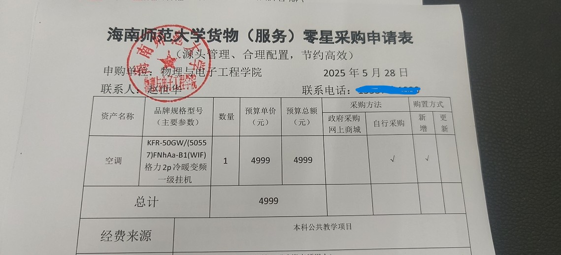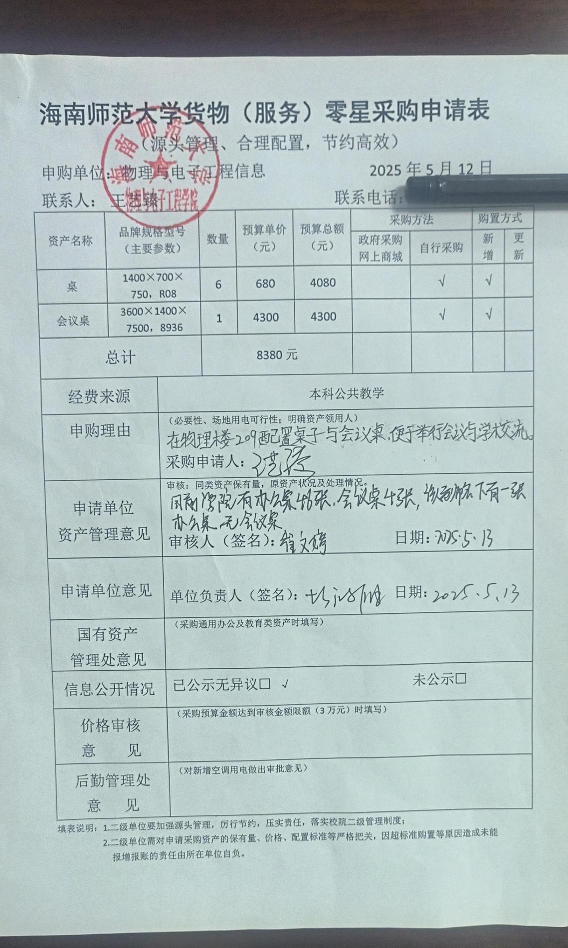 物理与电子工程学院王艺臻购买办公设备,公示如下,公示时间:2025年5月13日-5月16日。