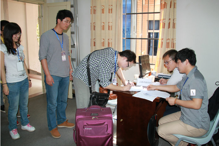 从23号开始,来自武汉、南京、广州,河北等地的志愿者开始陆续南行,大部分志愿者是在校大学生及在读研究生。截至26日中午已接待储备人员107位。25日的接待高峰储备人员更是络绎不绝。引路,行李搬运,登记,发卡,介绍学校情况及设施,送至宾馆。一项项小工作的叠加便是志愿者们一天的行程,重复再重复。但不论重复多少次,不论有多琐屑,志愿者一直笑容温馨,言辞温暖,举止贴心。志愿者小李一直接待,到了两点才找到空隙吃午饭,可当问她辛不辛苦时,她说:“大家都是一般大,都知道长途奔波的不易。他们不远千里来我们海师,我们是东道主,一定要招待好这些来自远方的客人。不仅要让他们感受到海师学子的真诚,还要让他们感受到海师的热情。我们的目标是事事周全。”话才说完,电话又响起了,小李放下吃了一半的盒饭,迅速接起电话:“您好,这里这海南师范大学国际交流学院·······”
