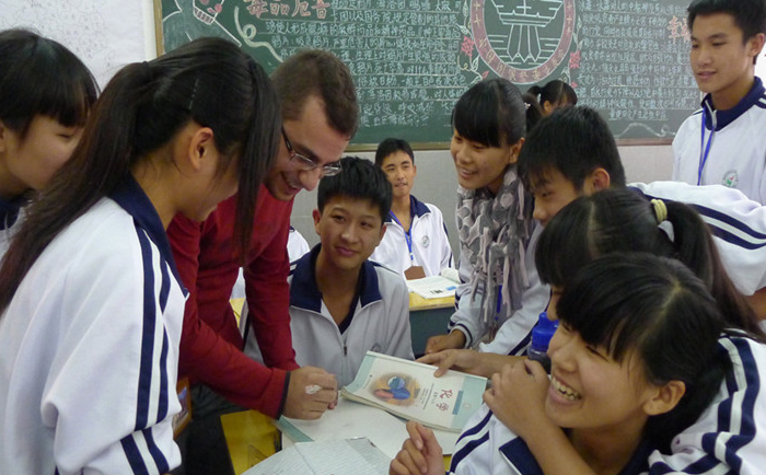 一到学校,留学生就分成七个组进入高一年级的七个班进行交流活动。留学生先用汉语作自我介绍 ,然后用英语跟学生互动。留学生的到来引起了学生的浓厚兴趣,他们积极回答问题,踊跃参与英语游戏,还跟着留学生“老师”学几句泰语、印尼语、俄语、法语,不同语种的问候声、欢快的笑声回响在校园里。原计划就在七个班进行一节课的交流,但其他班级的学生被这七个班的热烈气氛所感染,纷纷要求与留学生交流,于是留学生们没有休息一分钟就继续跟另外七个班的学生进行交流,不同语种的问候声、欢快的笑声再一次回响在校园里。两节课的交流时间很快就过去了,分别时学生们争着跟“老师”合影,唱着歌儿给“老师”送行,学生跟“老师”依依不舍。