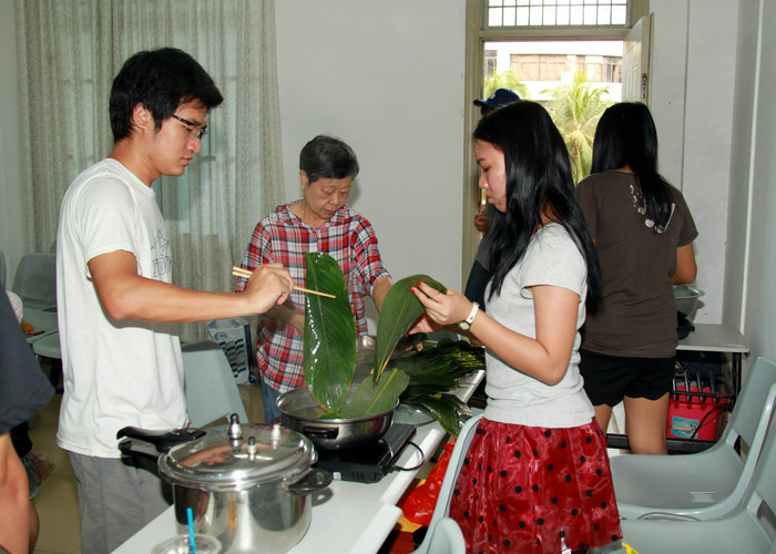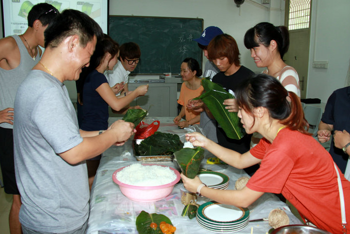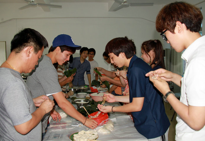 2013年6月8日,基地教学楼301教室热闹非凡。只见教室里人头攒动,欢声笑语,原来是国际文化交流学院的留学生在老师的带领下,正在举办别开生面的“包粽子,过端午”活动。