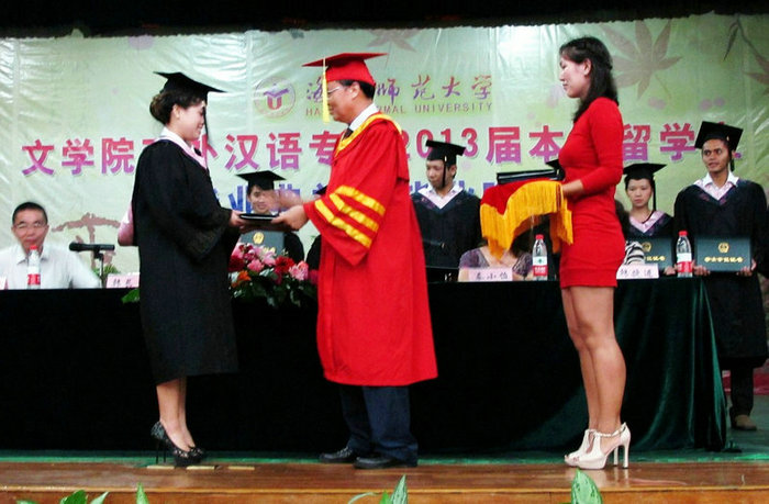 6月17日晚,我校在逸夫艺术楼音乐厅举行对外汉语专业2013届本科留学生毕业典礼暨毕业晚会。韩长日校长、杜明娥副校长出席毕业典礼,并观看了留学生们的毕业演出。