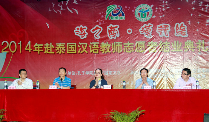 2014年3月29日晚,由东南亚汉语推广师资培训基地、国际文化交流学院承办的孔子学院总部/国家汉办2014年赴泰国汉语教师志愿者储备人员结业典礼暨汇报演出在我校逸夫艺术楼音乐厅隆重举行。