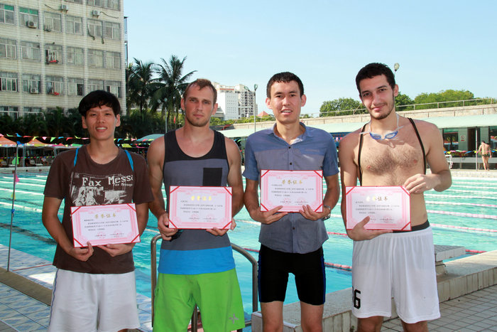 团体项目中,我院国际学生也获得较好成绩。鞠乘镐、大勇、伊丽莎白、李知宣等4人获得男女组合4*25米第二名;鞠乘镐、大勇、欧子、叶利那扎尔等4人荣获男子4*50米第三名。