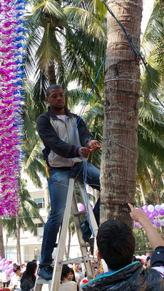 国际学生搭建游园大门
