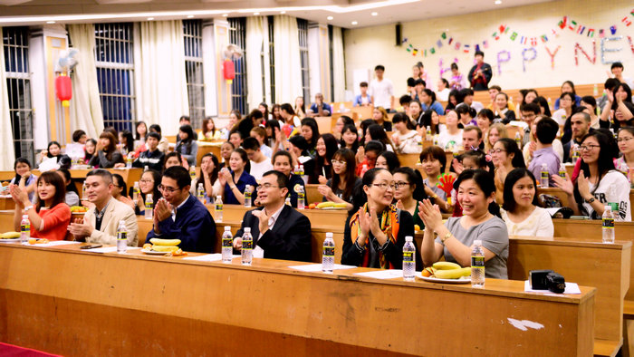 我院领导、各班主任和我院国际学生、“国际教室”全体志愿者齐聚一堂,喜迎新春。志愿者们用点点闪烁的灯饰装扮了晚会现场,并将一学期来各类活动的学生照片装饰成Happy New Year的图形在舞台上,更是为晚会添上一抹喜庆的气氛。