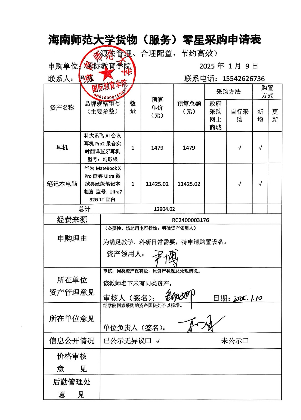 因教师科研、教学日常需要,我院教师特申请购买耳机一副、笔记本电脑一部。经费来源为博士科研启动项目经费(RC2400003176)。