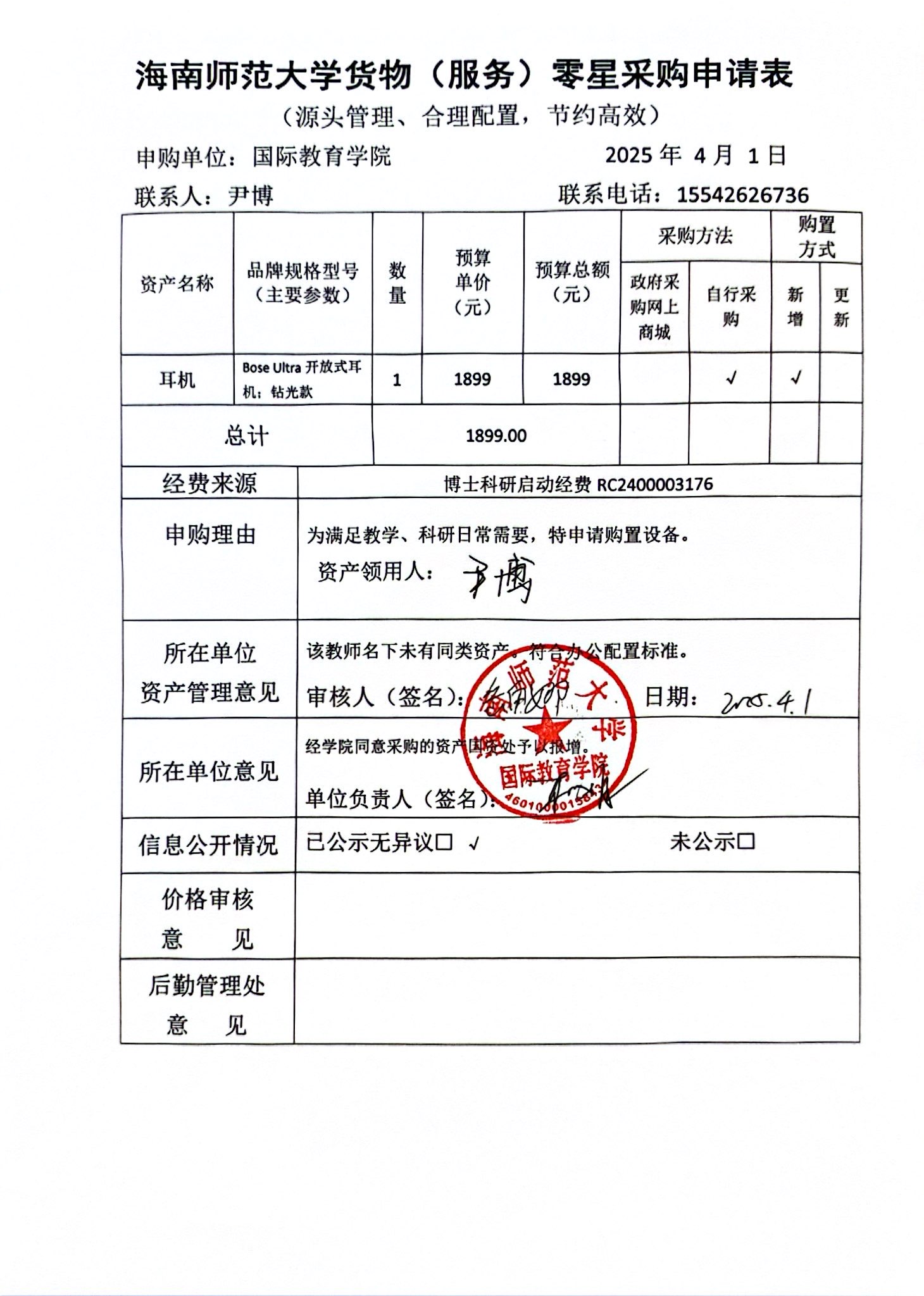 因教师科研、教学日常需要,我院教师特申请购买耳机设备一部。经费来源为博士科研启动项目经费(RC2400003176)。
