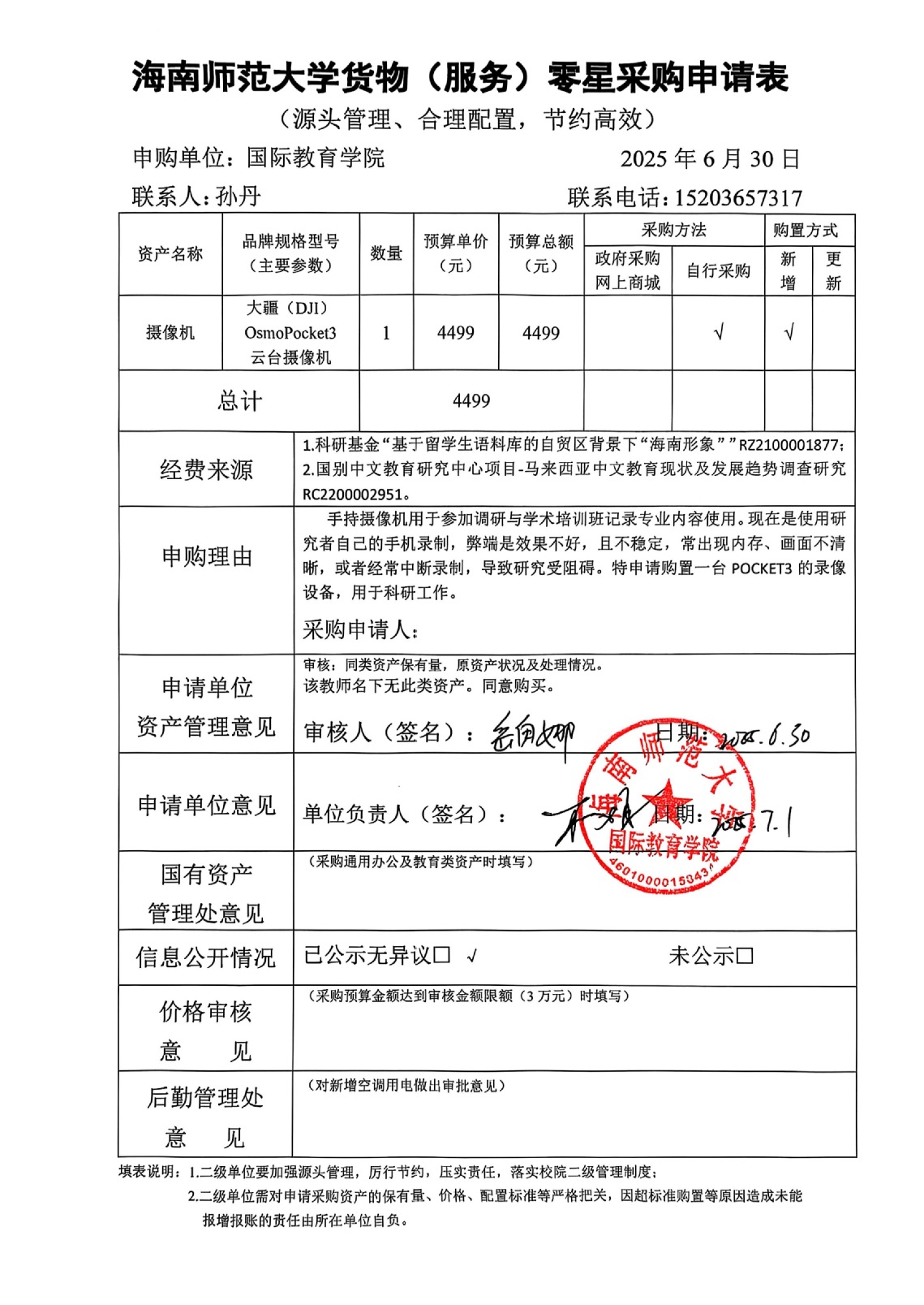 手持摄像机是调研参加学术培训、记录专业知识的必备工具。由此,基于研究需要,急需购入一台POCKET3的录像设备。资产领用人为孙丹。