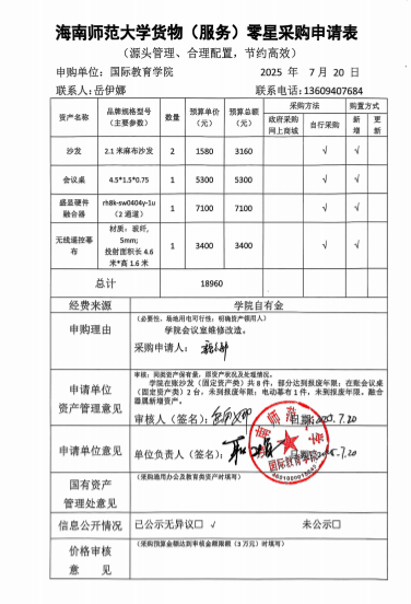 学院会议室维修改造,需更换会议桌、沙发及幕布等资产。