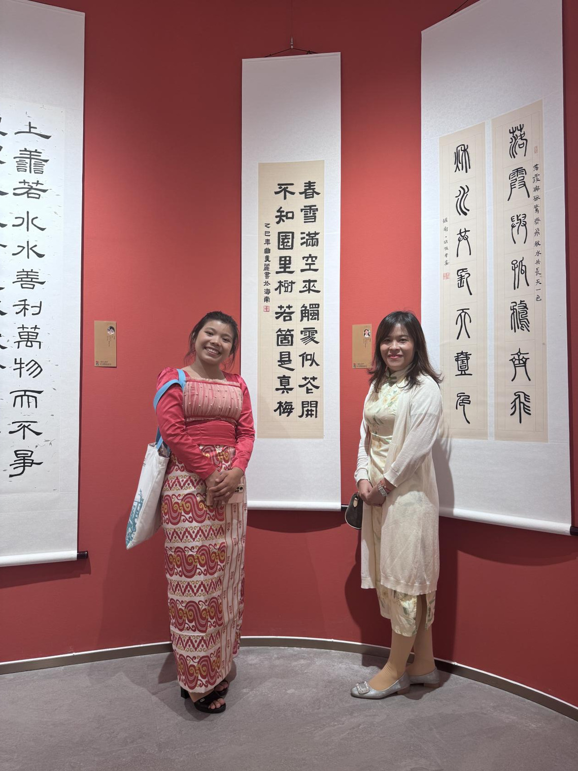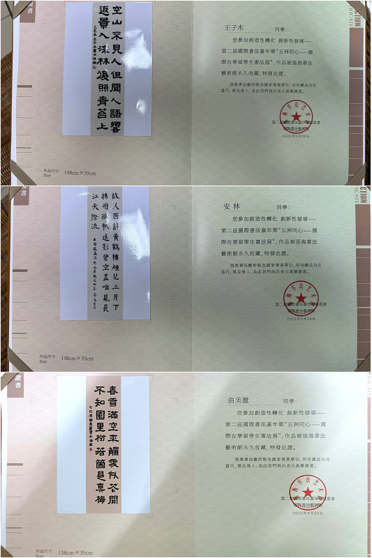 活动期间,我院选送的王子木、曲美丽、安林三位留学生的书法作品成功入选“五洲同心国际在华留学生书法展”。入展作品分别由安福勇、韩燕花老师指导。三位学子的作品既展现了对传统书法技法的扎实掌握,也传递出对中华文明的深刻理解。其中,曲美丽同学在韩燕花老师的带领下还出席了嘉年华开幕式,并现场挥毫泼墨,以精湛的书写技艺展示个人作品,成为现场焦点