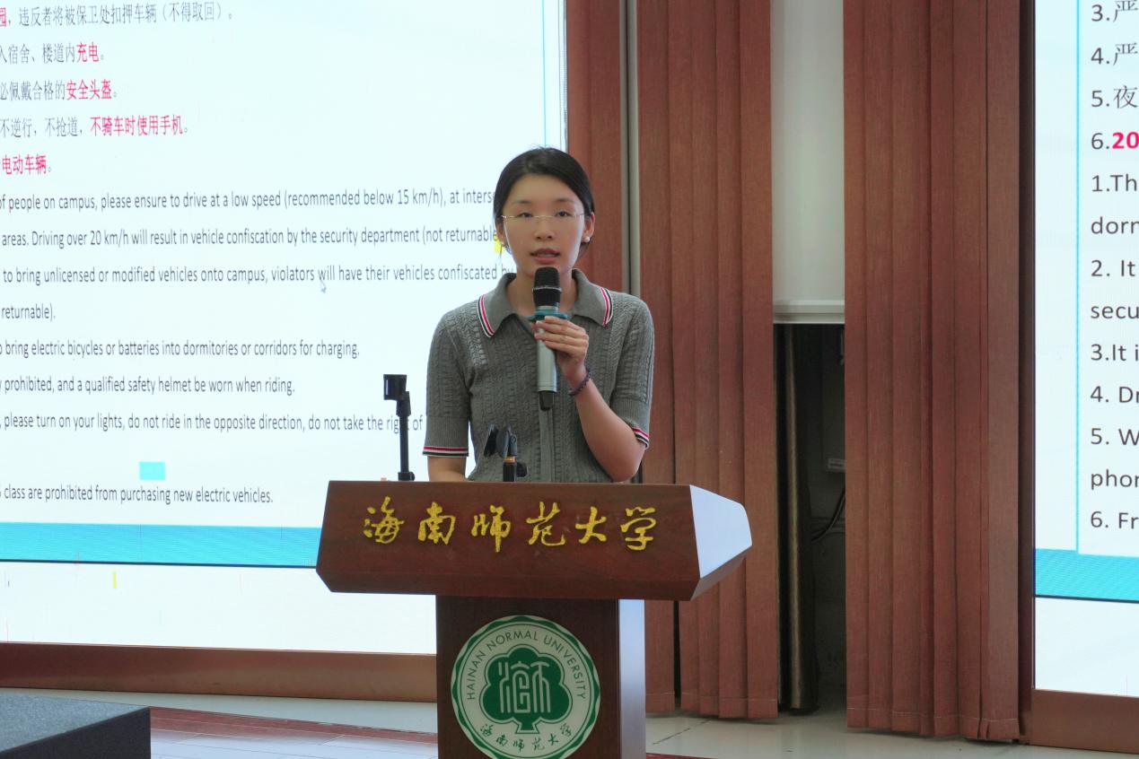 吴辰书记做开场发言。他指出留学生除了要重视学习,还必须关注交通安全问题,并介绍了近年来国际学生在海南发生的一些交通事故案例。他希望各位同学能够从本次宣讲会中有所收获,自觉遵守校规校纪和交通规则。
