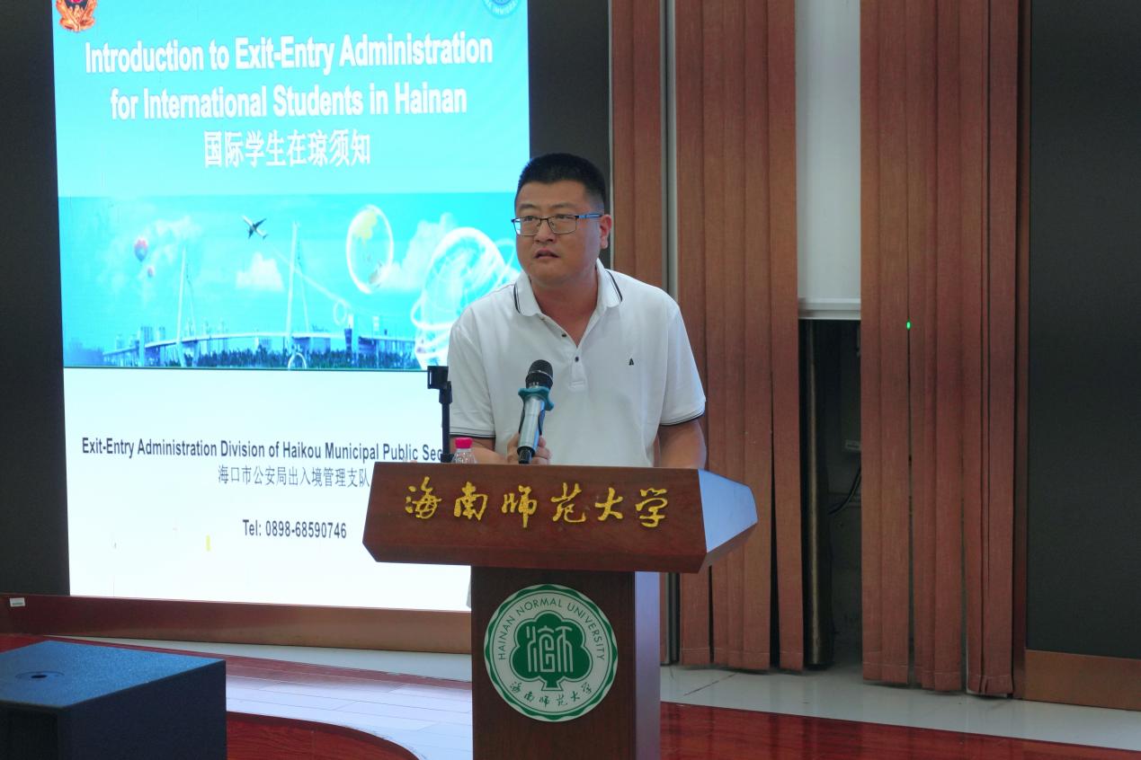 为了帮助我院国际新生顺利开启留学新篇章,快速适应学术与生活环境,促进跨文化交流,我院于2025年9月19日下午在文科楼201报告厅召开了2025国际学生入学教育宣讲会。海口市公安局警官梁雪娟、黄家燕,海口市公安局琼山分局警官蔡于华,忠介派出所警官陈诗柳、陈京,海南师范大学民警陈人榜,海南师范大学保卫处副处长李应伟,海南师范大学国际教育学院党委书记吴辰,海南师范大学国际教育学院留学生辅导员郭孜奕、胡红芝,海南师范大学国际教育学院宿舍管理员吴清菊与国际学生出席宣讲会。