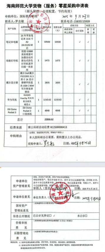 因教师科研、教学日常需要,我院教师特申请购买电脑、打印机、显示器、耳机和手机相机各一台。经费来源为博士科研启动项目经费(RC2500000413)。