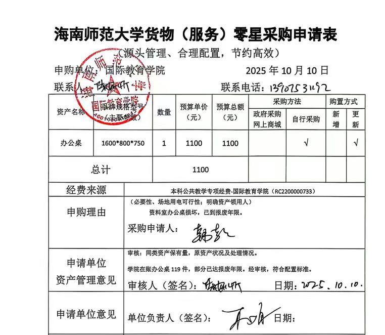 文科楼一楼102办公室办公桌损坏,申请购置新办公桌。经费来源为RC2200000733。