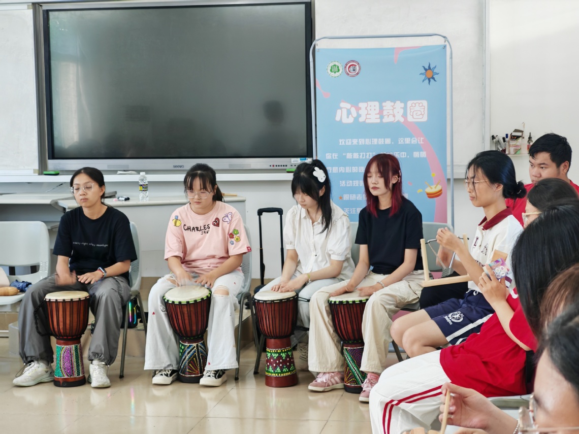 欧卡牌心理互动借助潜意识投射原理,帮助学生觉察潜在的情绪与思维模式;鼓圈音乐疗愈则通过集体合奏,让学生在节奏中释放压力、舒缓情绪,有效缓解入学初期的焦虑与思乡之情。