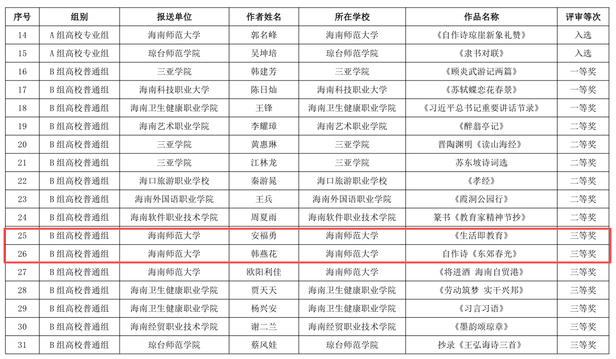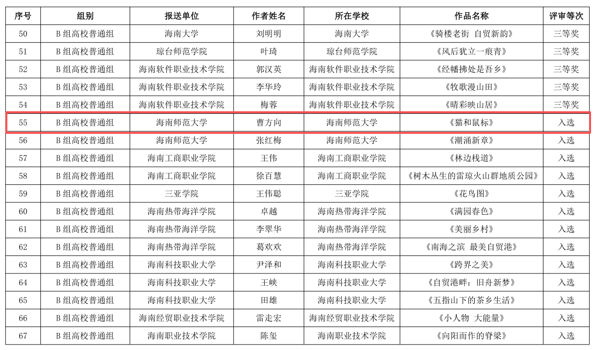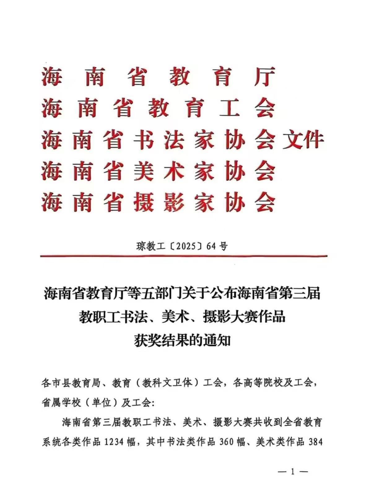我院3名老师在2025年海南省第三届教职工书法、美术、摄影大赛中荣获佳绩,特此祝贺!