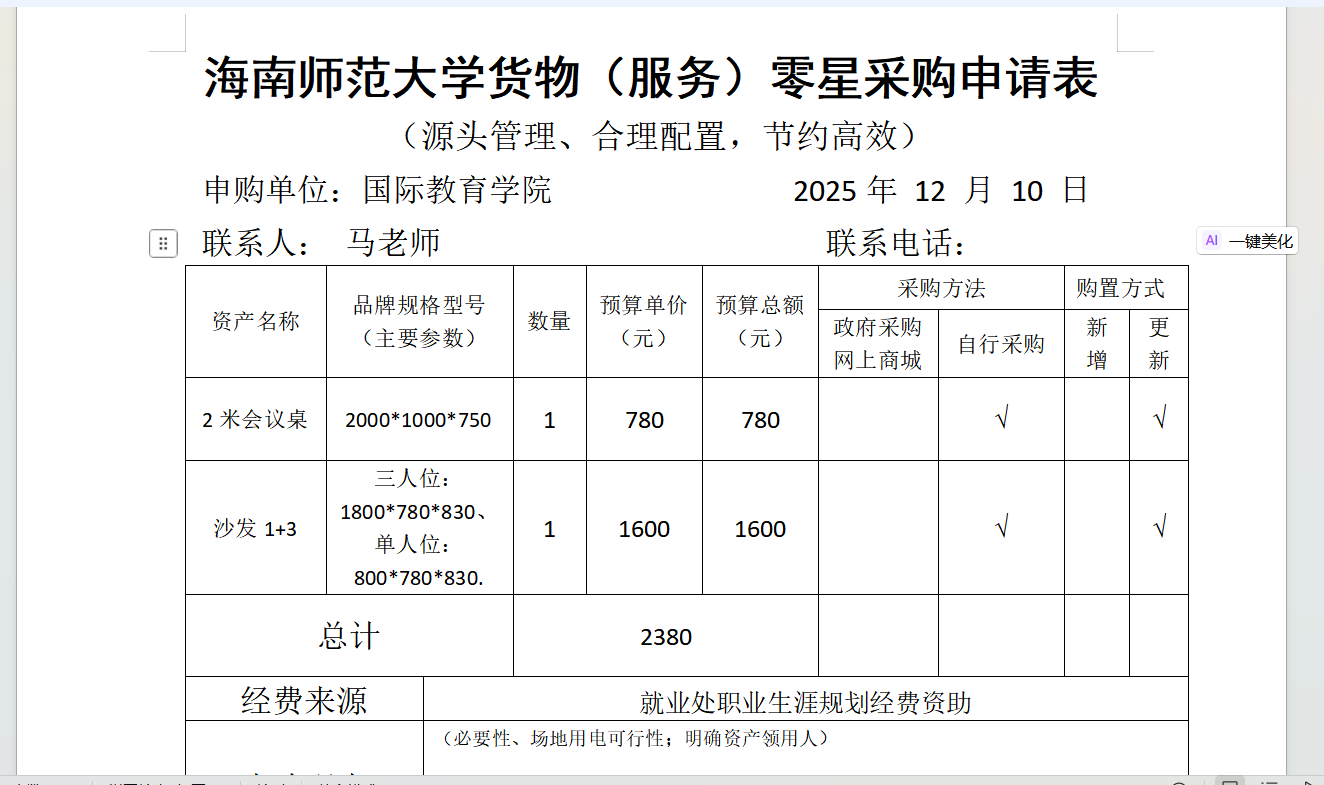 现因心理咨询室工作需要,申请采购家具如下,现已公示,如有异议,请联系马老师,0898-65813412。